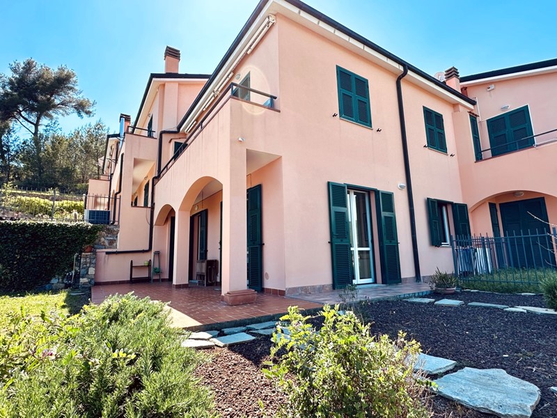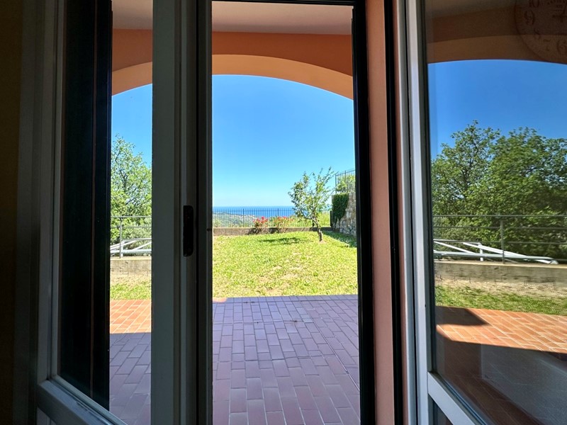 Lo spazio esterno attorno ai due lati liberi della casa è piastrellato ed in parte loggiato e spazioso, come una grande terrazza sul giardino. Poi c’è il giardino vero e proprio, con qualche rosa che sta a guardare il mare.?A fianco della zona giorno, una cameretta, anche utilizzabile come salotto per la lettura e le chiacchiere. Pure da questa stanza si vede il mare e possiamo uscire in giardino. ?Sul lato est della casa abbiamo la camera da letto matrimoniale. Dalla finestra la veduta è sul verde degli uliveti di fronte. ?Il bagno è spazioso, ha la doccia e la finestra verso nord; vista prati ed alberi. ?Un disimpegno tra la zona giorno e quella notte rappresenta uno spazio per una dispensa o ripostiglio. ?L’appartamento è circa 74 metri quadrati. ???Con la proprietà vengono ceduti anche una cantina e due posti auto ad uso esclusivo.