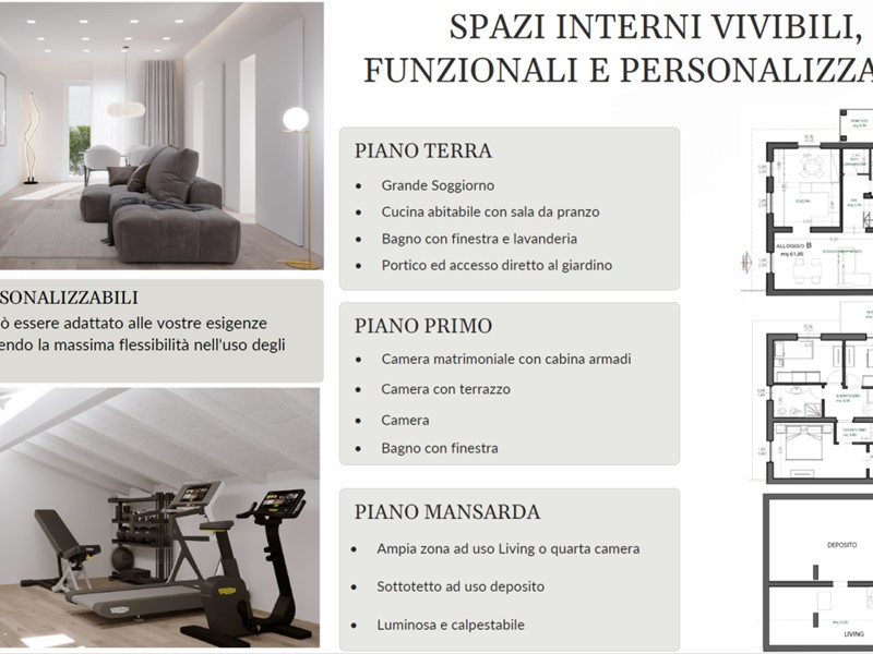 L’abitazione si sviluppa su due livelli principali, oltre a mansarda e sottotetto. Al piano terra sono previsti i parcheggi privati, l’accesso al giardino recintato e il porticato d’ingresso che conduce nell’ampio soggiorno, seguito da una cucina abitabile con sala da pranzo, bagno finestrato, lavanderia, ripostiglio e una comoda scala che porta al piano superiore. Qui si trovano una camera matrimoniale con cabina armadi, due camere singole (di cui una con terrazzina) e un secondo bagno finestrato. Infine, tramite scale interne, si accede alla luminosa mansarda calpestabile, utilizzabile come living o quarta camera, con annessa porzione di sottotetto ad uso soffitta/ripostiglio.
