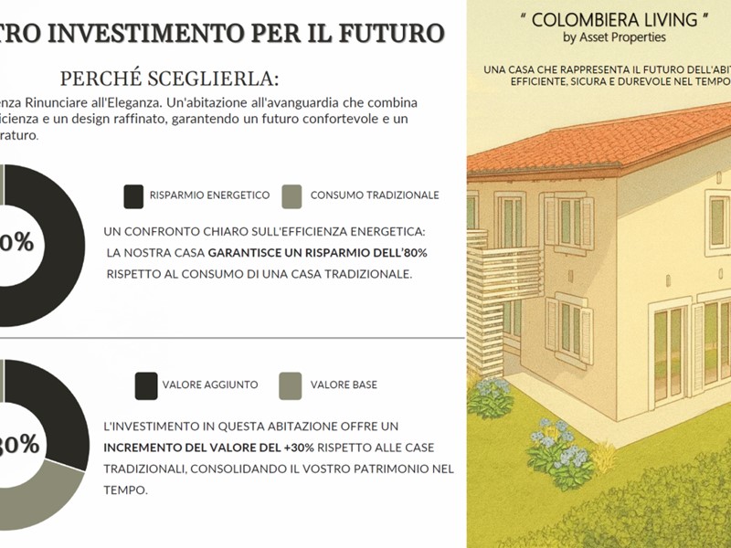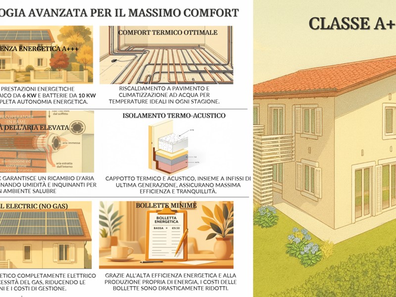 Dal punto di vista della sicurezza e dell’efficienza, l’immobile sarà interamente elettrico: non sono previste utenze a gas, eliminando ogni rischio di scoppio o avvelenamento e semplificando la gestione delle forniture. L’impianto fotovoltaico, già predisposto per l’accumulo, contribuisce insieme agli altri accorgimenti costruttivi (murature esterne, copertura e infissi ad alte prestazioni) a garantire un’abitazione sostenibile, con costi di esercizio ridotti e con elevate prestazioni in termini di comfort abitativo.