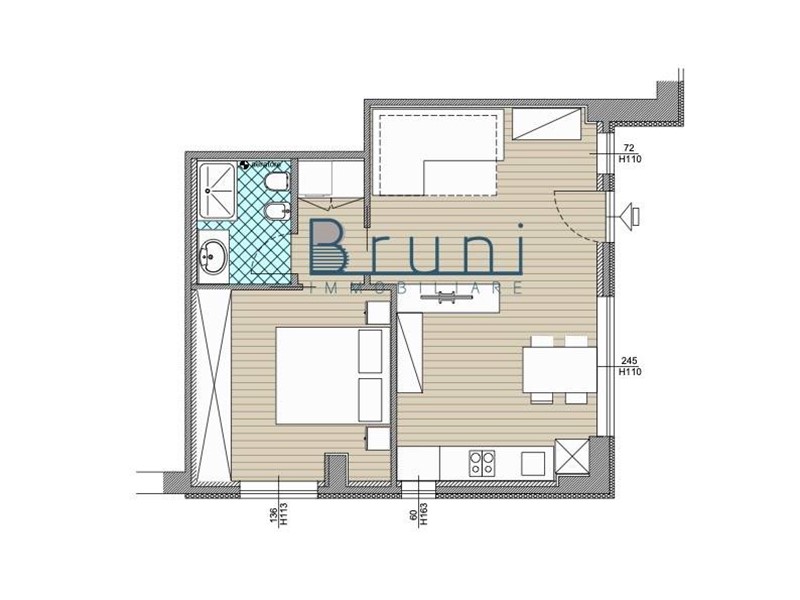 Composto da: ingresso su ampio soggiorno con cucina a vista, una camera da letto matrimoniale, un bagno ad areazione forzata con cabina doccia.