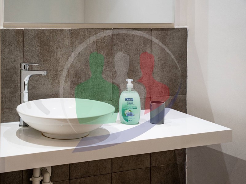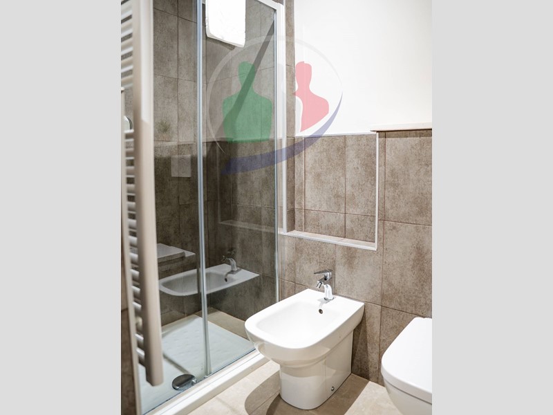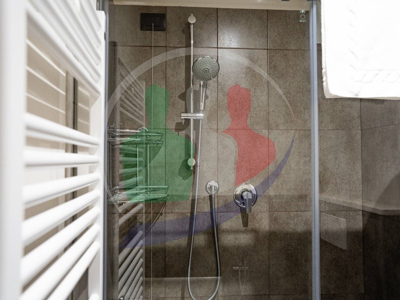 Dal soggiorno si accede al bagno finestrato con box doccia.