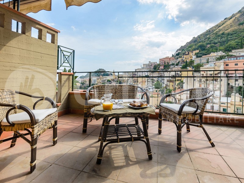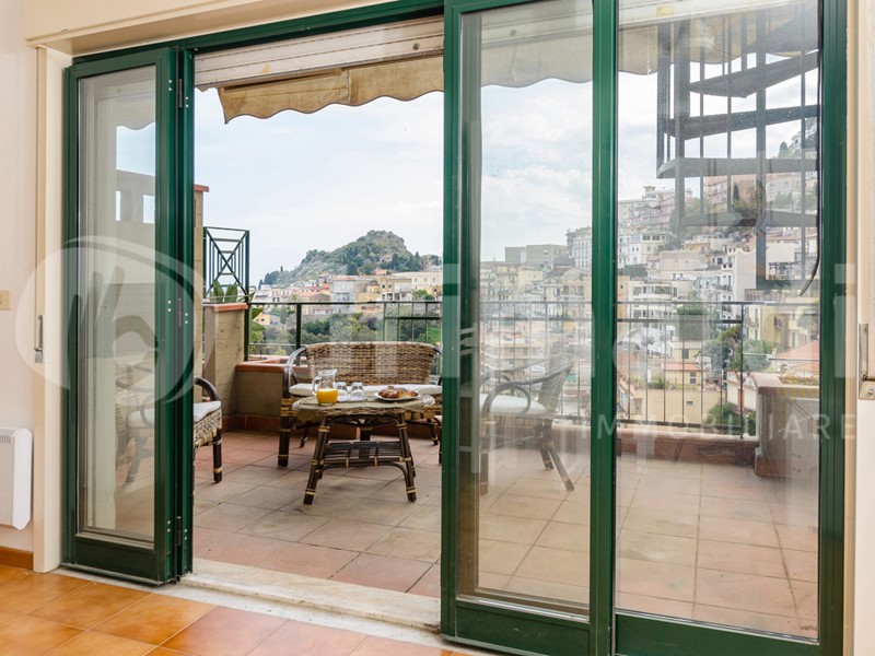 Taormina cpl. "Gardenia" Via Fontana Vecchia panoramico appartamento composto da soggiorno con zona cottura, camera da letto, bagno, veranda di 15 mq con vista panoramica, terrazza soprastante di 80mq direttamente collegata con scala dall'appartamento.