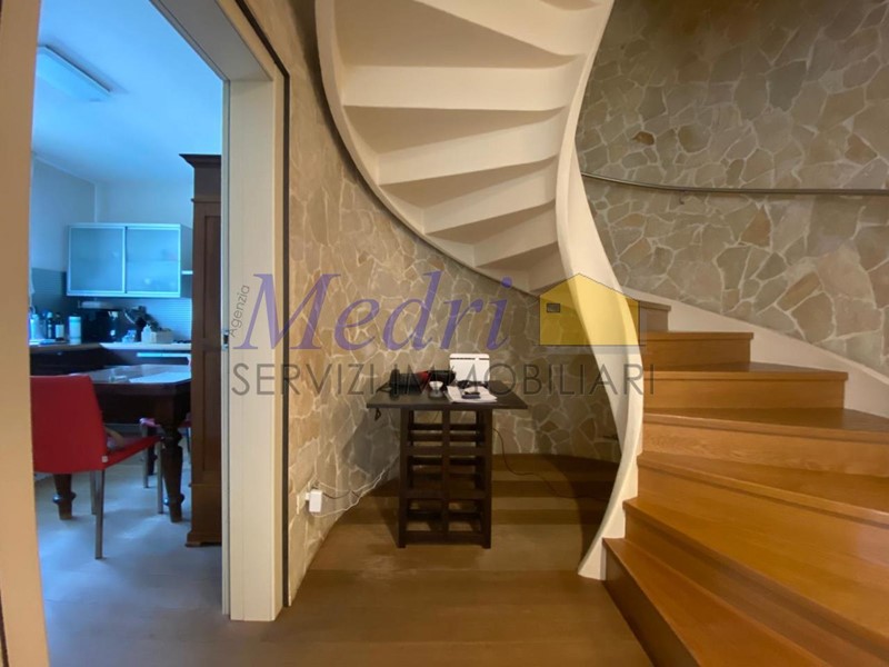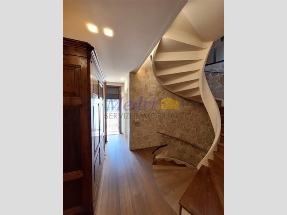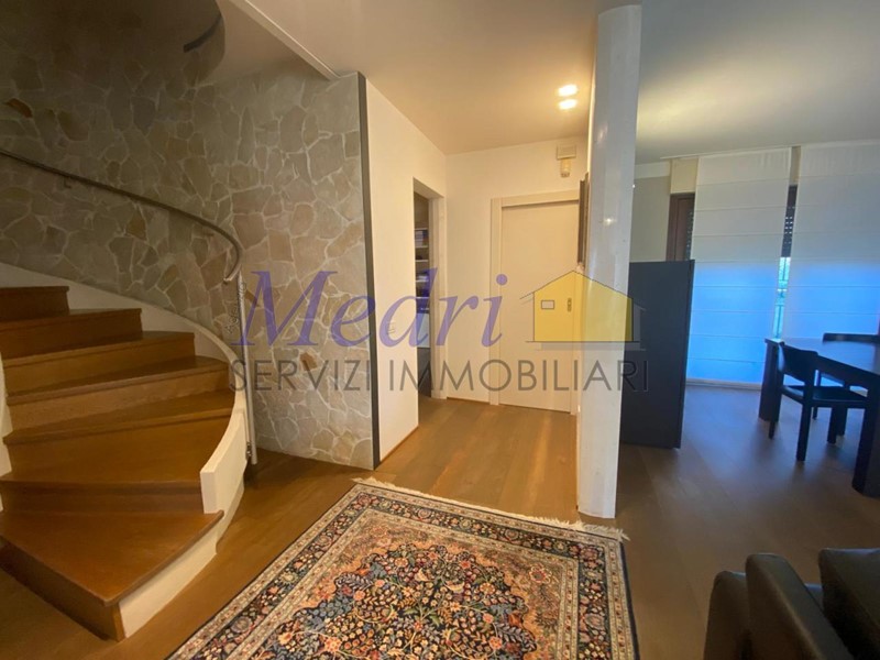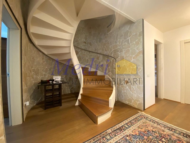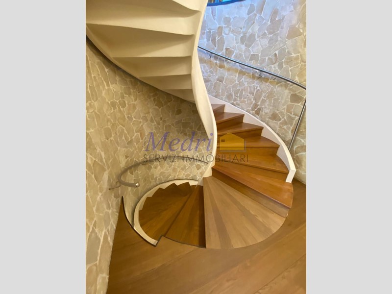 La residenza si sviluppa su tre piani, collegati internamente da una scenografica scala elicoidale realizzata in materiali di pregio, che conferisce carattere e continuità agli ambienti. L'abitazione è accogliente fin dal primo sguardo: il bel portico a piano terra ci introduce in un ampio ingresso da cui si accede a spazi luminosi e ben distribuiti, come la ariosa zona soggiorno con camino di circa 30 mq., la cucina abitabile dal carattere conviviale, il bagno, lo studio e la pratica lavanderia/stireria con doccia. Al piano primo la zona notte ospita tre camere da letto matrimoniali, una cabina armadio, due bagni, due balconi che garantiscono funzionalità e riservatezza. Completa la villa, un piano sottotetto, perfetto come secondo studio, sala hobby o ambiente per ricevere ospiti.