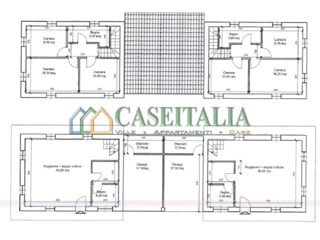 L'unità abitativa è composta da due livelli così divisi: al piano terra soggiorno con angolo cottura, ripostiglio e bagno, al piano superiore tre camere e un bagno.