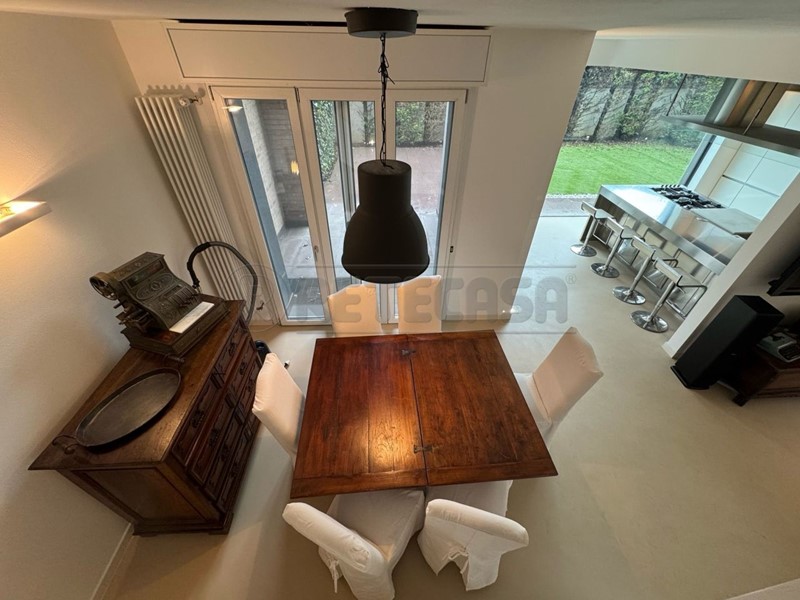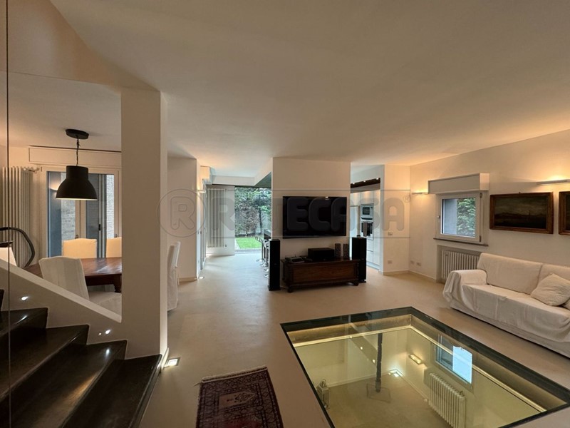Al piano terra troviamo un grande salone openspace, dotato di ampia vetrata con vista sul giardino e suddiviso in bellissima cucina a vista, zona pranzo ben separata e zona soggiorno. Presente inoltre un bagno di servizio.
