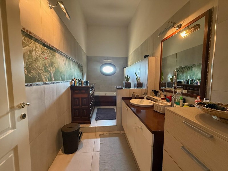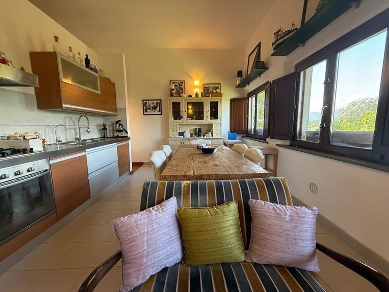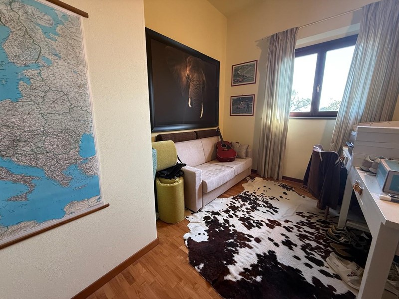 L’abitazione si apre su una luminosissima zona living, separata dalla cucina abitabile da una parete attrezzata che accoglie un comodo ripostiglio e una pratica lavanderia. Scendendo tre scalini si accede ad una suggestiva zona relax, oggi adibita a sala biliardo ma facilmente trasformabile in camera matrimoniale. La zona notte si compone di una camera matrimoniale, una camera media e doppi servizi, di cui uno finestrato con vasca e l’altro con doccia.