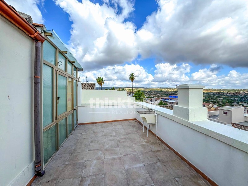 Primo piano: terrazza panoramica con vista sui tetti del borgo e sul paesaggio circostante, più un ulteriore vano adatto a studio, camera per gli ospiti o soggiorno.