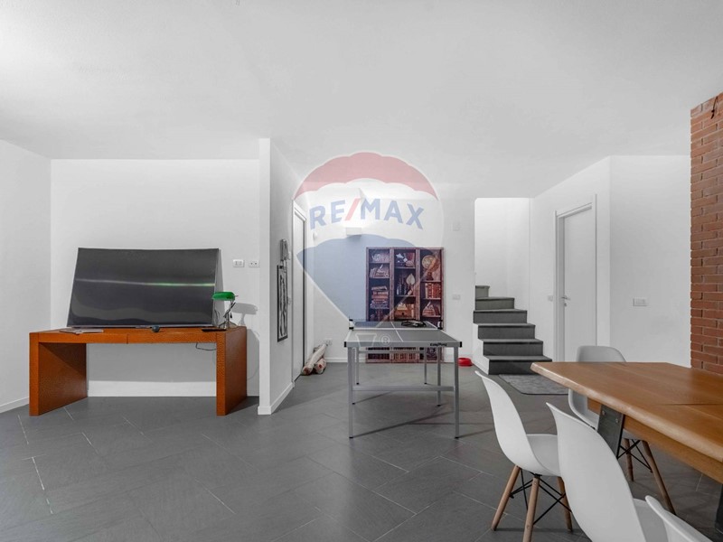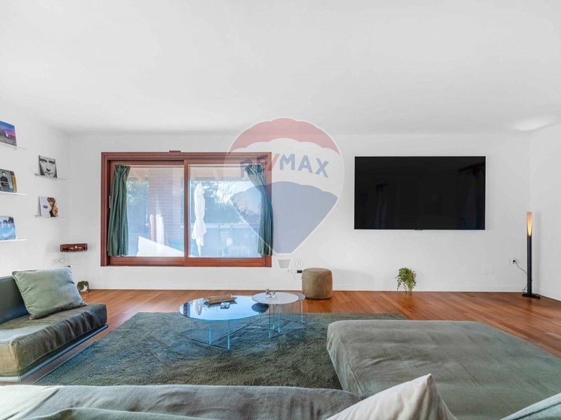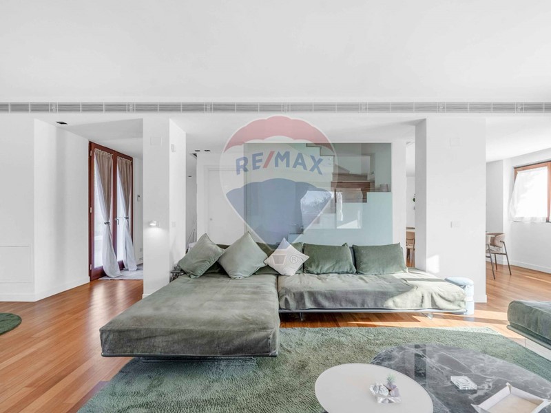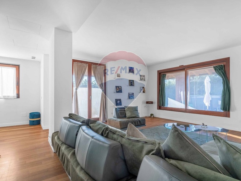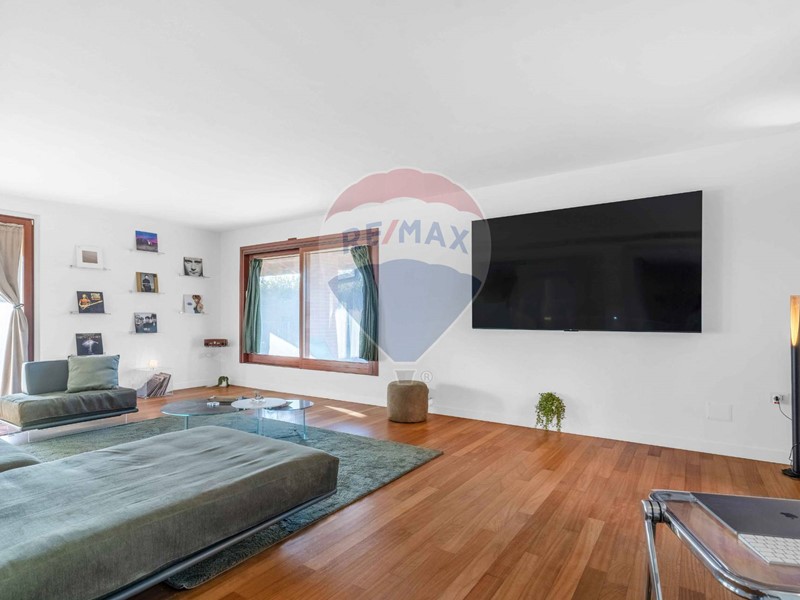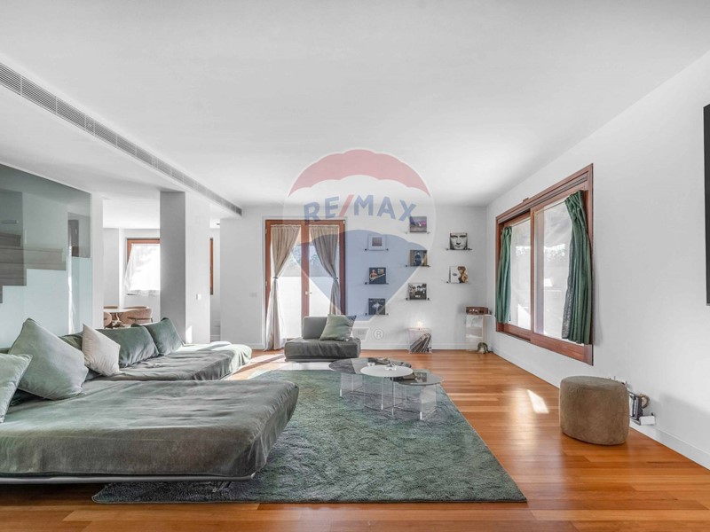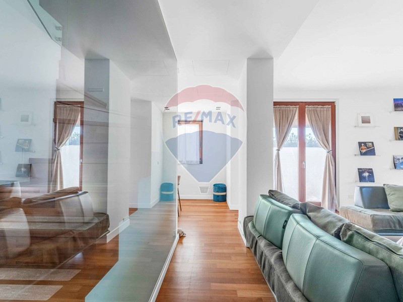 Il piano terra, circondato da ampie porte-finestre che regalano luminosità agli ambienti, si apre su un spazioso soggiorno, ideale per momenti di relax e convivialità.