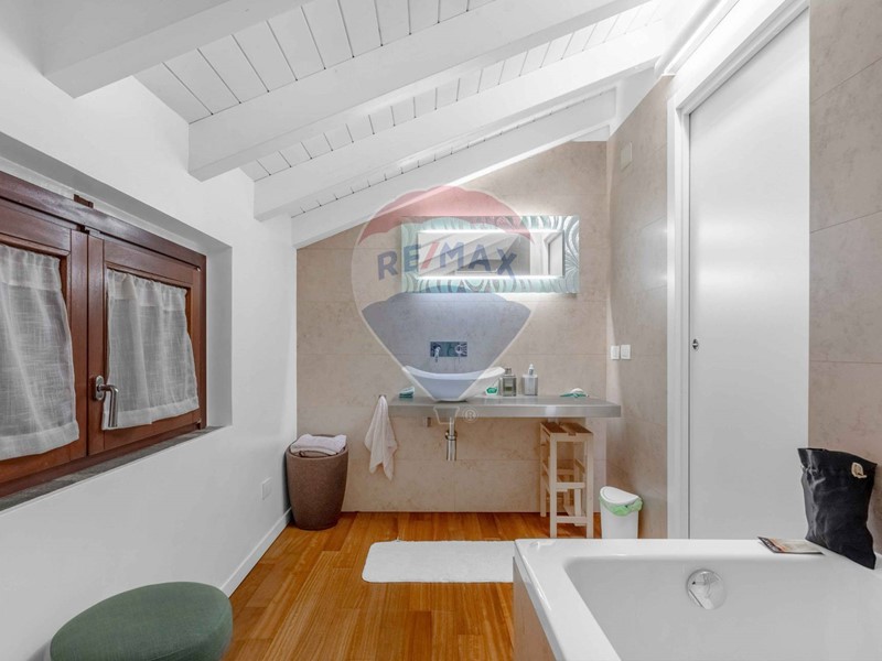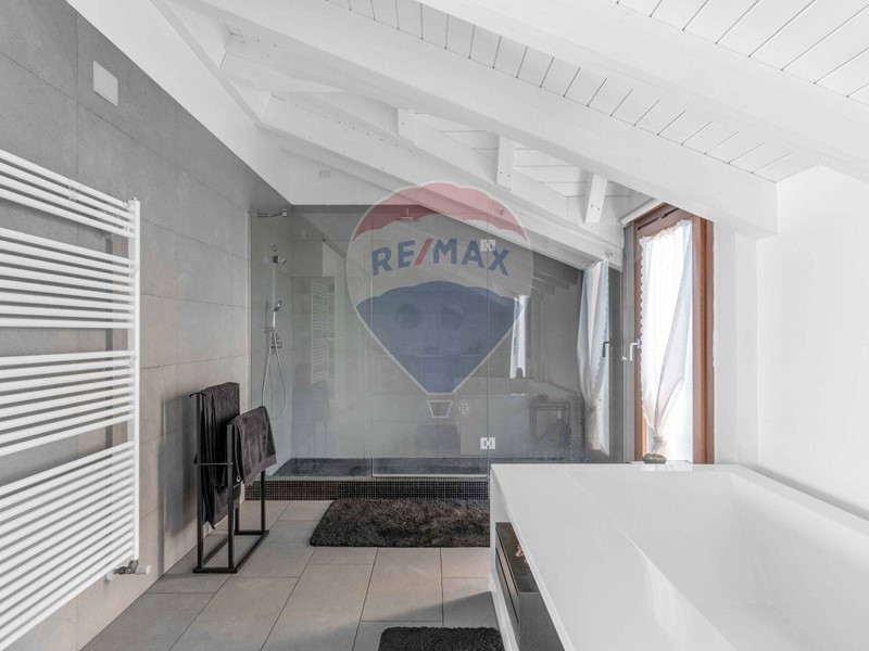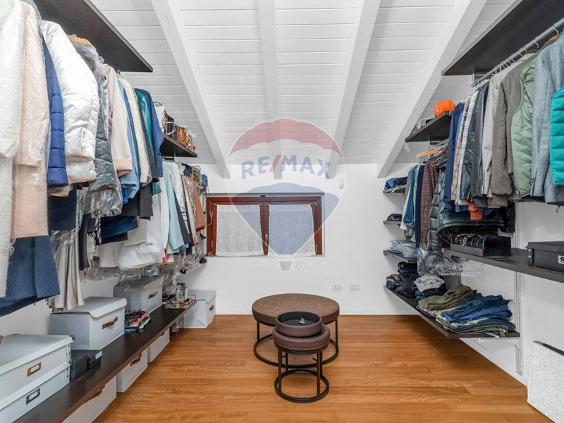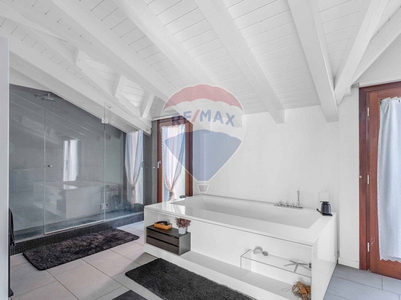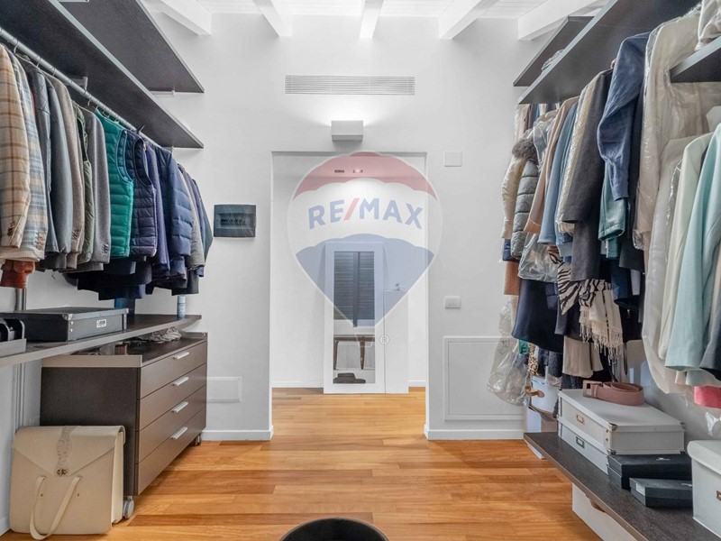 Suite padronale con ampia cabina armadio e bagno privato con doccia, vasca e sanitari separati da porta scorrevole.