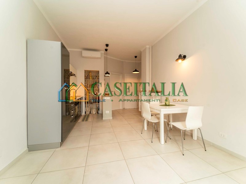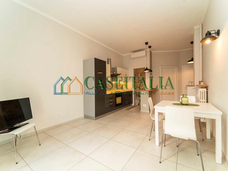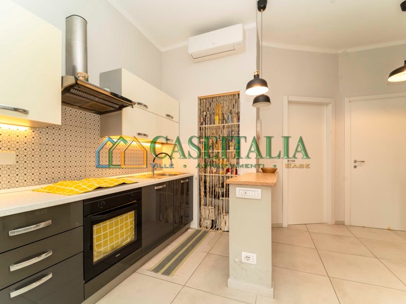 L’immobile si compone di un ampio ingresso, un soggiorno luminoso con cucina a vista con porta finestra che affaccia su un balcone, una camera da letto matrimoniale con accesso a una veranda esterna e un bagno finestrato completo di box doccia.
