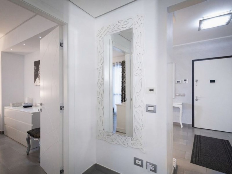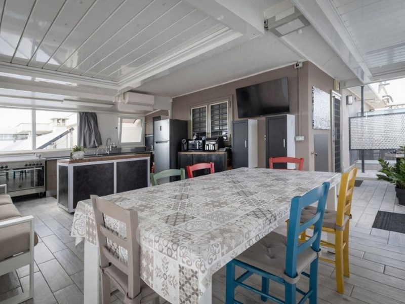 Sullo stesso piano si trovano una camera matrimoniale, una camera singola e un bagno finestrato con doccia. Sia la zona living che la camera padronale accedono direttamente a una delle terrazze, di circa 33 mq, attrezzata con comode armadiature in alluminio e salottino.