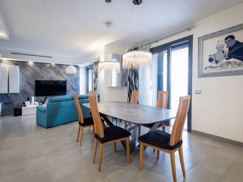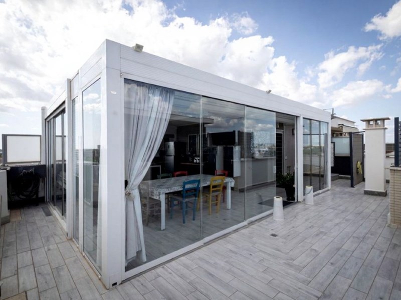Protagoniste assolute sono appunto le ampie terrazze, concepite non come semplici estensioni esterne, ma come veri ambienti abitativi. Le vetrate frangivento tutto vetro e le pergotende motorizzate trasformano questi spazi in un salotto en plein air dotato di cucinotto completamente attrezzato, perfettamente vivibile in ogni stagione vista anche la presenza di fan coil caldo/freddo.