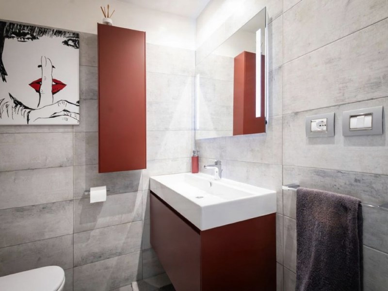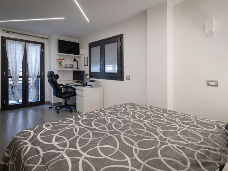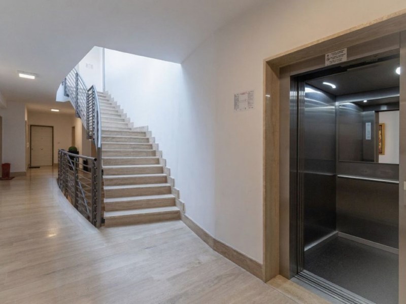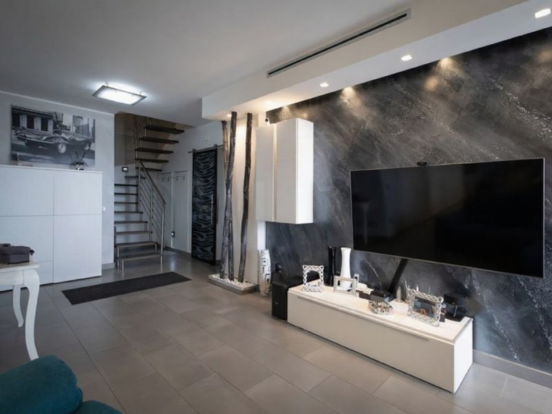 La comoda scala interna, con parete impreziosita dal rivestimento in Kerlite conduce al piano superiore, dove una camera con bagno privato, separata da porta blindata verniciata a polvere bianca, offre un ambiente intimo e riservato con accesso alla terrazza più ampia di circa 77 mq.