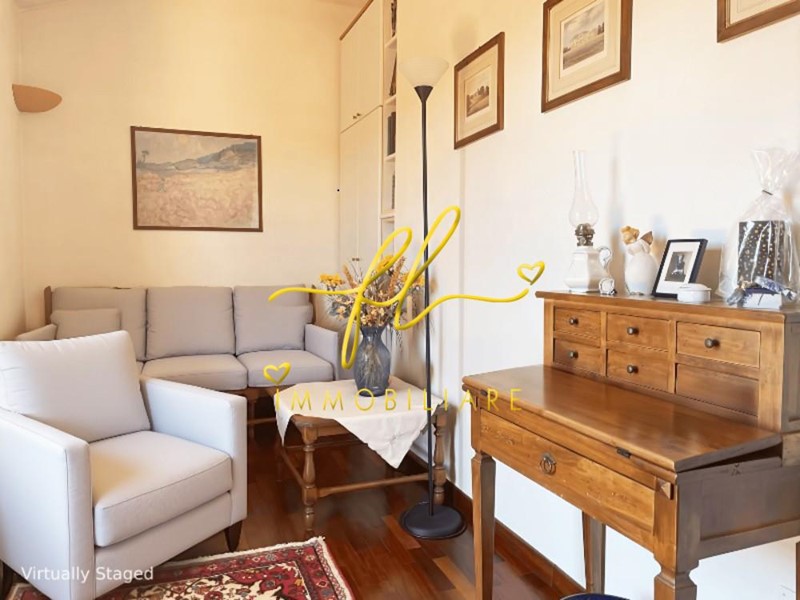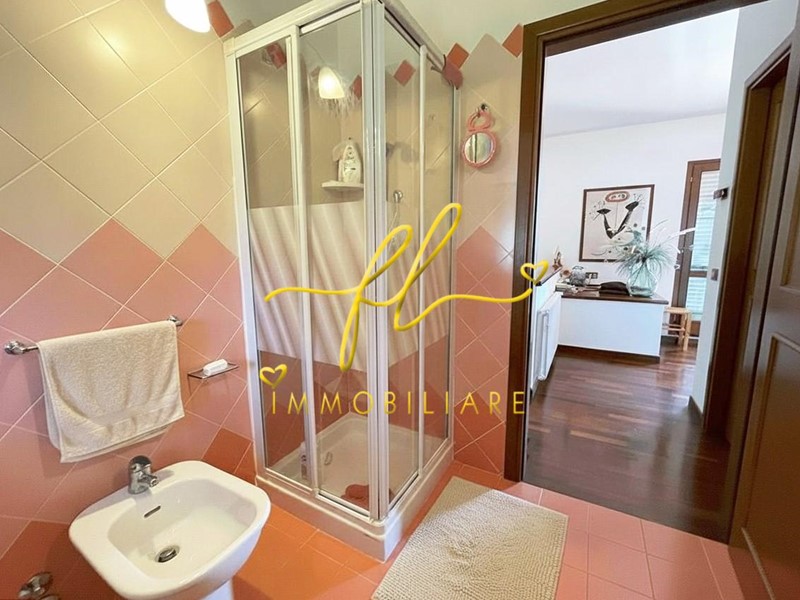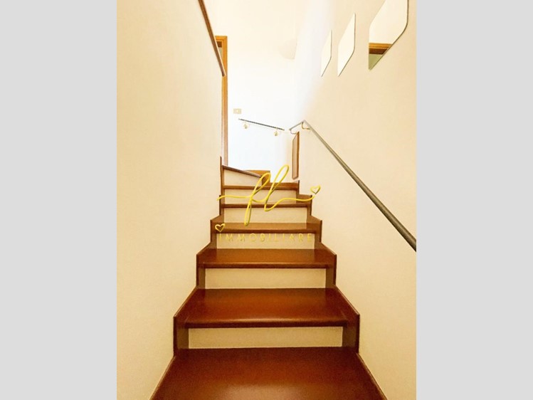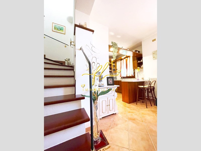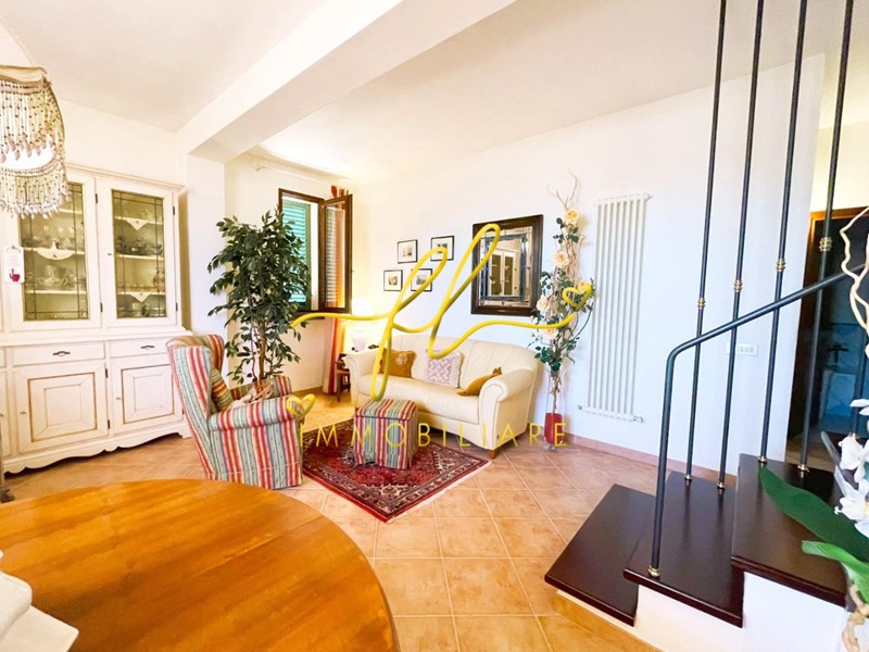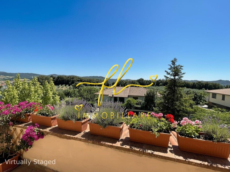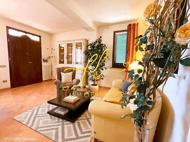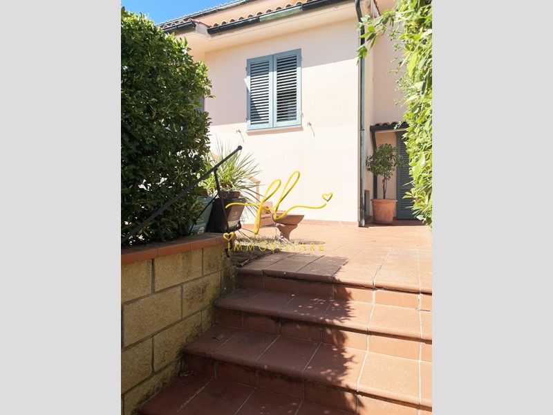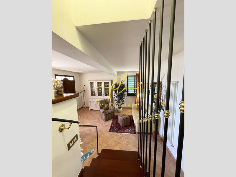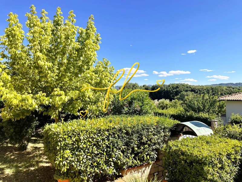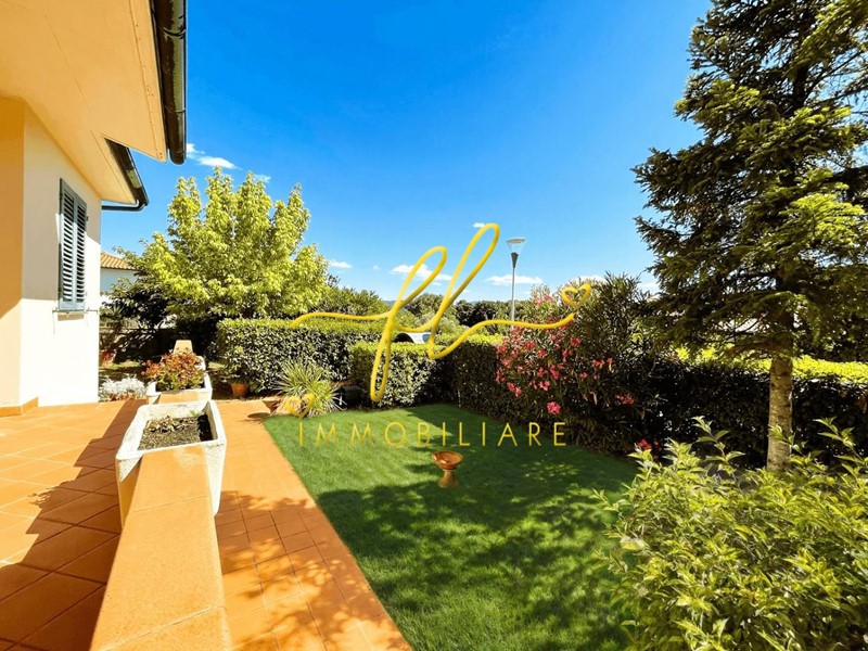La casa, luminosa e spaziosa, si sviluppa su tre livelli offrendo vari ambienti . Il piano terra della villetta, rialzato e collegato al giardino tramite comoda scala esterna di pochi gradini è così distribuito: ingresso principale su salottino e zona pranzo giorno rivolta a sud, cucina con dispensa, ampia camere matrimoniale, bagno finestrato con doccia. Da scala a giorno si accede al primo piano dell'abitazione composto da ulteriore camera matrimoniale, secondo bagno finestrato anch'esso con doccia, ulteriore locale/studio da cui si accede da ampia porta a vetri su splendida terrazza a tasca da cui si gode uno splendido panorama sulle colline toscane. Al piano seminterrato, collegato da scala interna completano la proprietà taverna con accesso diretto al giardino, lavanderia, cantine e garage con accesso carrabile da strada laterale la proprietà.
