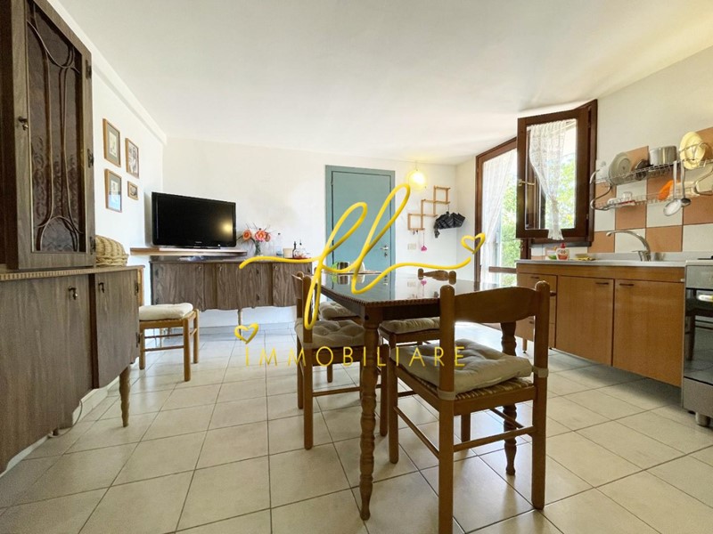 Zona giorno luminosa con soggiorno, pranzo e cucina con dispensa