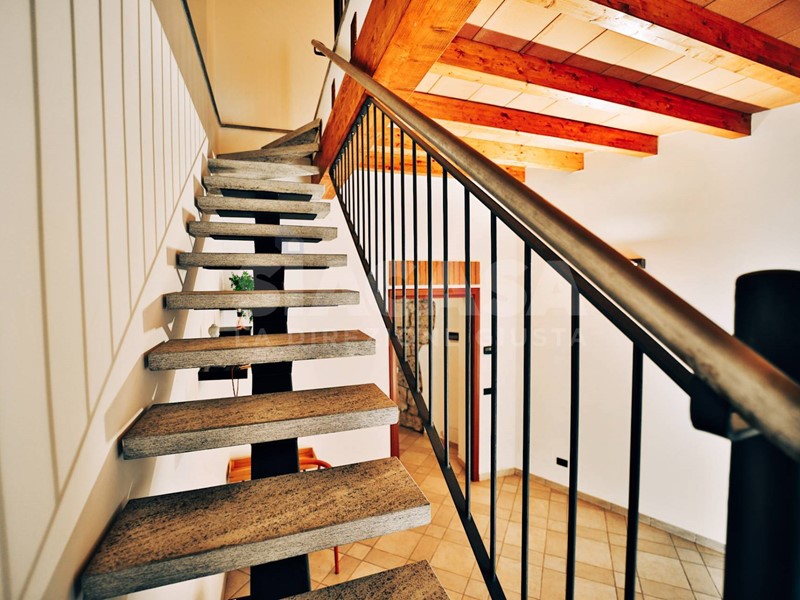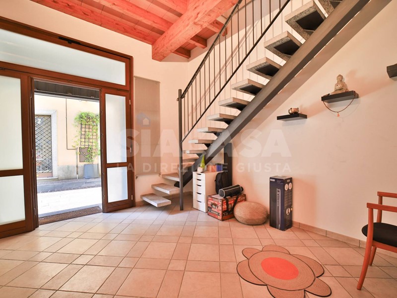 La pietra a vista, le travi lignee e le finiture ricercate dialogano con una scala in ferro e pietra dal gusto contemporaneo, creando uno spazio di lavoro che trasmette prestigio e identità. Tre accessi indipendenti dalla strada, dal portone sul cortile interno e direttamente al primo piano assicurano praticità e riservatezza.
