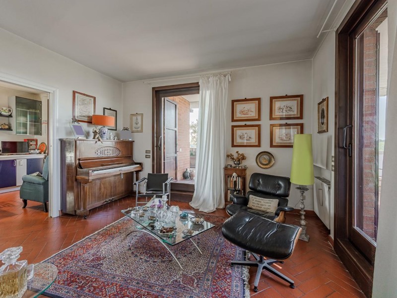 ✨ Atmosfera esclusiva: Rifiniture di pregio, pavimento in cotto e un camino dal design classico-moderno, che insieme creano un ambiente elegante e accogliente.