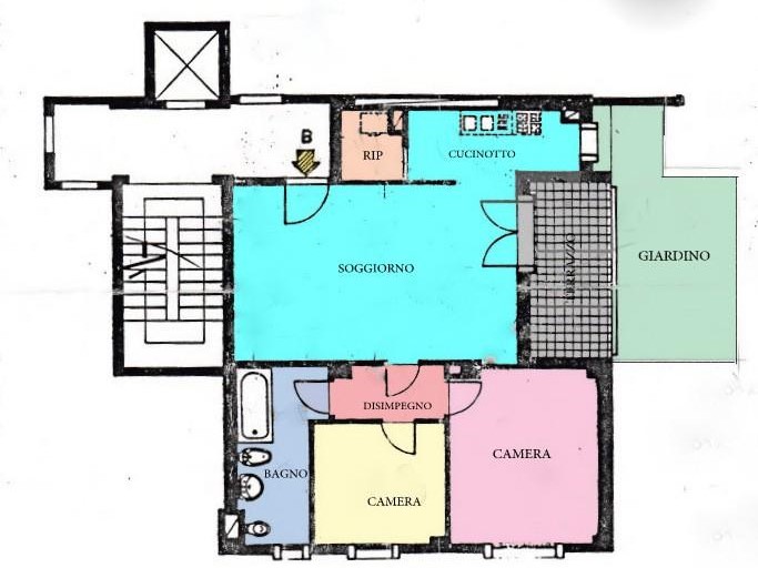 L’appartamento occupa una superficie di circa 80 mq. e si compone di un’ ampia zona giorno formata da soggiorno, angolo cottura e ripostiglio, e con apertura su terrazza coperta verandata che a sua volta ci conduce ad piccolo giardino privato dove poter trascorrere momenti di relax all’aria aperta. La zona notte si compone poi da 2 camere da letto di cui una matrimoniale ed una singola, il disimpegno ed uno spazioso bagno finestrato con box doccia.
