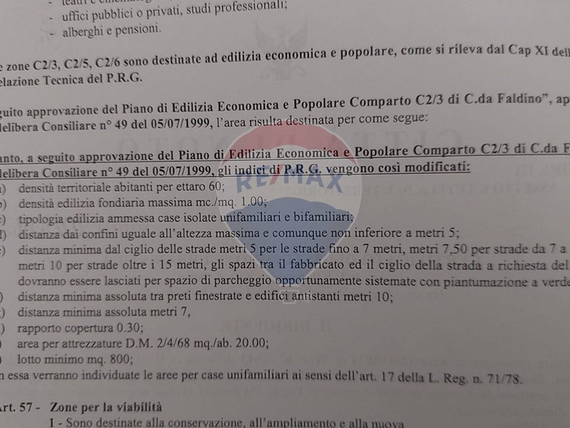 Terreno ricadente nel comparto zona C 2/3 - edilizia semintensiva, destinata ad edilizia economica popolare come da relazione Tecnica del P.R.G ed in parte ricade in Zona destinata alla viabilità stradale.