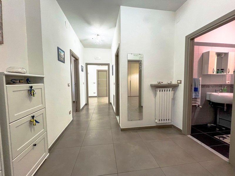 Cammini verso la zona giorno passando per un disimpegno ben organizzato: la cucina abitabile ti accoglie con la sua atmosfera calda e funzionale, affacciata su un secondo balcone che guarda verso l'ingresso del parco. Un piccolo dettaglio che fa la differenza? La finestra vicino al piano cottura che regala luce e aria fresca mentre cucini.