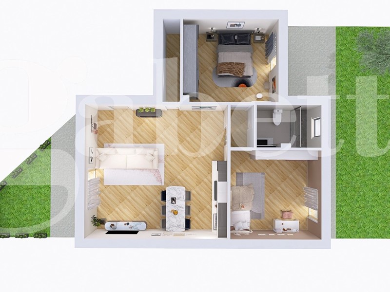 APPARTAMENTO CON GIARDINO in complesso residenziale progettato per offrire soluzioni moderne e funzionali proponiamo appartamento con giardino e locale di sgombero sfruttabile come tavernetta. L'inizio cantiere e previsto per novembre 2025. L'alloggio si presenta con ingresso living su ampia zona giorno, disimpegno, due camere da letto e un bagno. La zona giorno si affaccia su un giardino riservato, mentre la zona notte dispone anch'essa di un secondo giardino privato. Una scala in muratura conduce al piano seminterrato dove troviamo un ampio locale di sgombero sfruttabile come tavernetta, una lavanderia e un box.