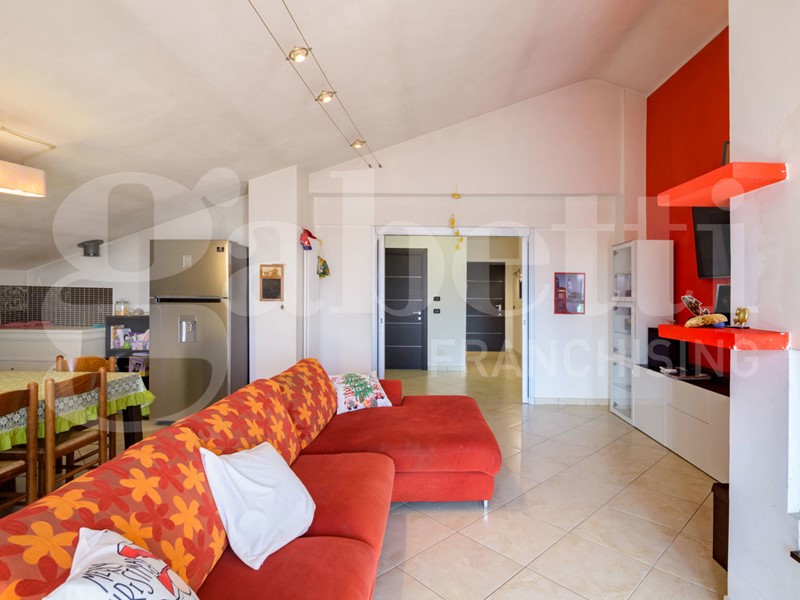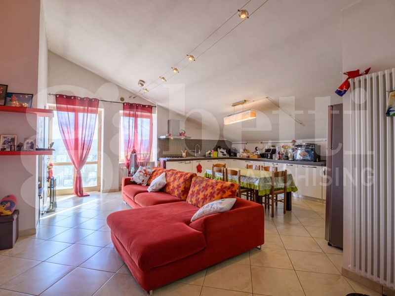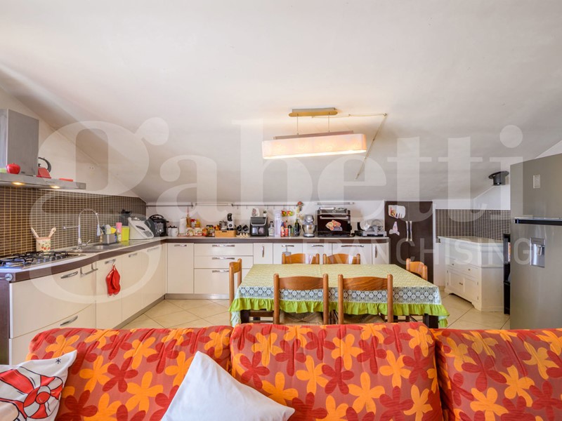 L'ingresso si apre su un grande salone accogliente, perfetto per le serate in famiglia o con amici. La cucina a vista, moderna e funzionale, crea uno spazio aperto e conviviale. Entrambi gli ambienti affacciano su un terrazzo.