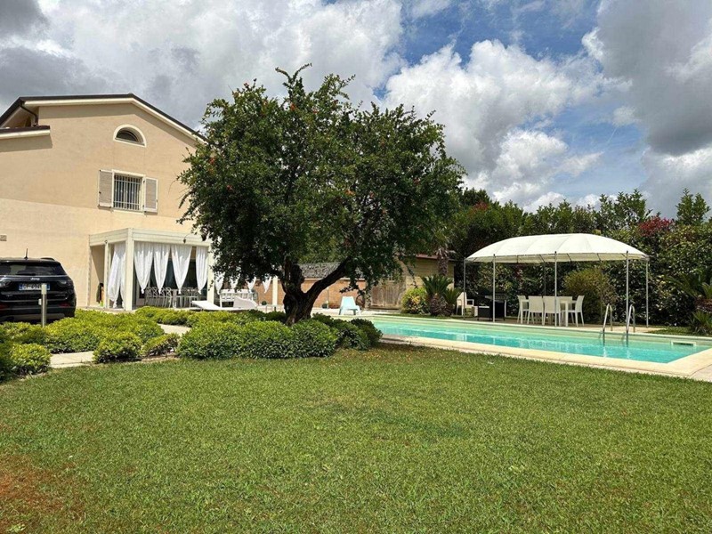 Al piano terra, troverete un luminoso soggiorno aperto nella zona cucina pranzo, ideale per momenti di convivialità, e un bagno di servizio. Completano il piano una veranda di 30 mq, un giardino di 1260 mq, e un posto auto di 30 mq, offrendo ampi spazi esterni per godere del relax all'aria aperta. Al primo piano, la villa dispone di tre camere da letto ed un bagno, garantendo il massimo della privacy e del comfort per tutta la famiglia. Al piano superiore open space con finestre e lucernari e bagno con vasca idromassaggio. Ogni ambiente è stato progettato con attenzione ai dettagli e alle finiture, in condizioni seminuovo. Il riscaldamento a pavimento e la presenza di un condizionatore nel soggiorno assicurano un clima ideale in ogni stagione. La villa è dotata di ingresso indipendente, che conferisce ulteriore privacy e autonomia. Il giardino è attrezzato di piscina (5x11mt) e casina per ricovero attrezzi. Situata in una zona tranquilla e ben servita, questa villa è la scelta perfetta per chi desidera vivere in un ambiente elegante e confortevole, senza rinunciare alla comodità dei servizi. Non perdere l'occasione di visitare questa straordinaria proprietà. - Rif. 4239