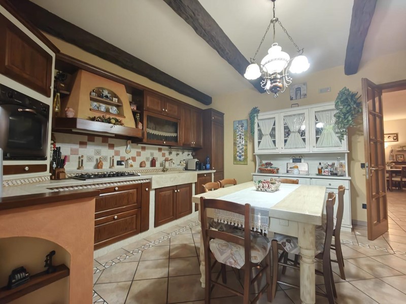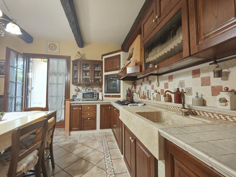 Cucina in muratura con caminetto, accogliente e funzionale, con uscita diretta sul resede privato esterno dove pranzare e cenare all’aperto.