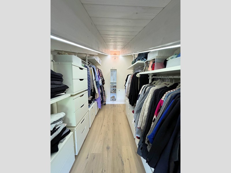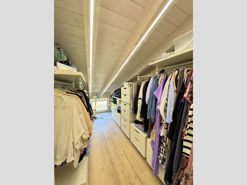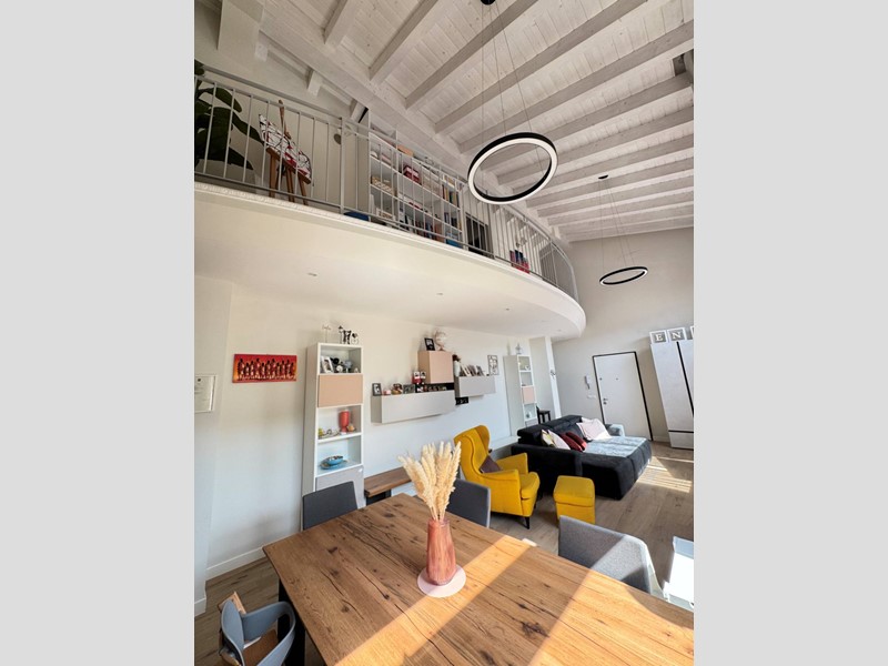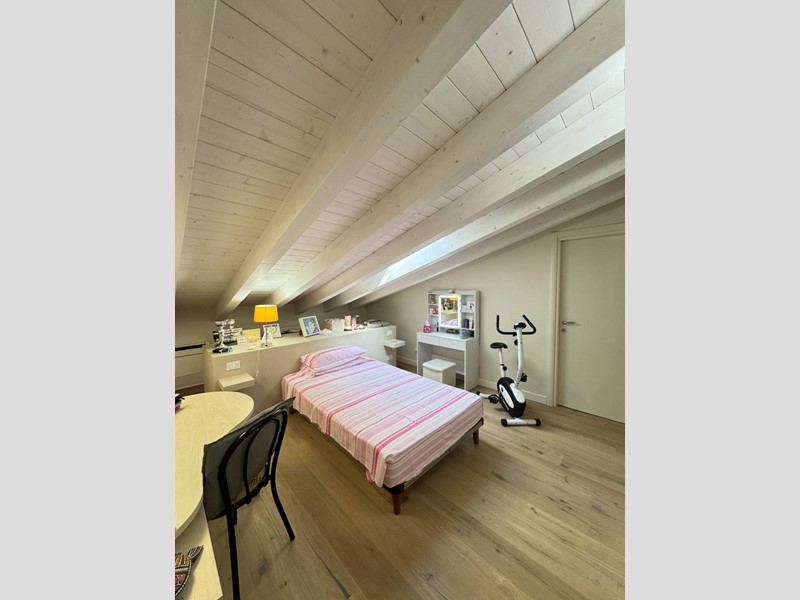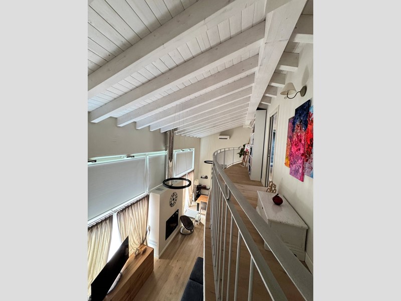 Piano Superiore dove troviamo ulteriore stanza adibita a camera da letto , bagno con doccia e finestrato, e cabina armadio spazio soppalcato di notevoli dimensioni che affaccia sul soggiorno, offrendo continuità visiva tra livelli.