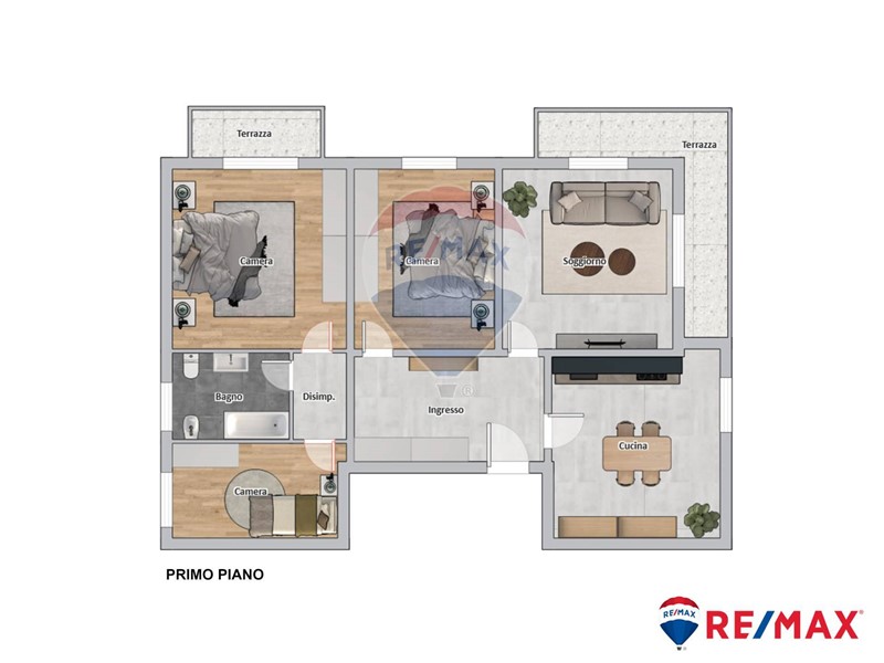 L'appartamento, luminoso e ben distribuito, è così composto: ampio ingresso, cucina separata abitabile, salotto con accesso ad un terrazzo in comune alla cucina, tre comode camere da letto (una doppia, una matrimoniale con terrazzo ed una singola) ed un bagno finestrato con vasca.
