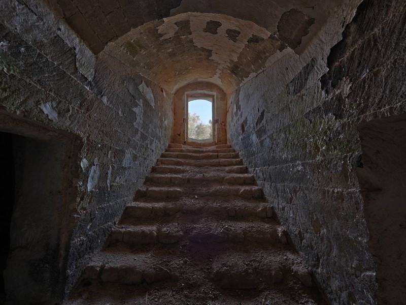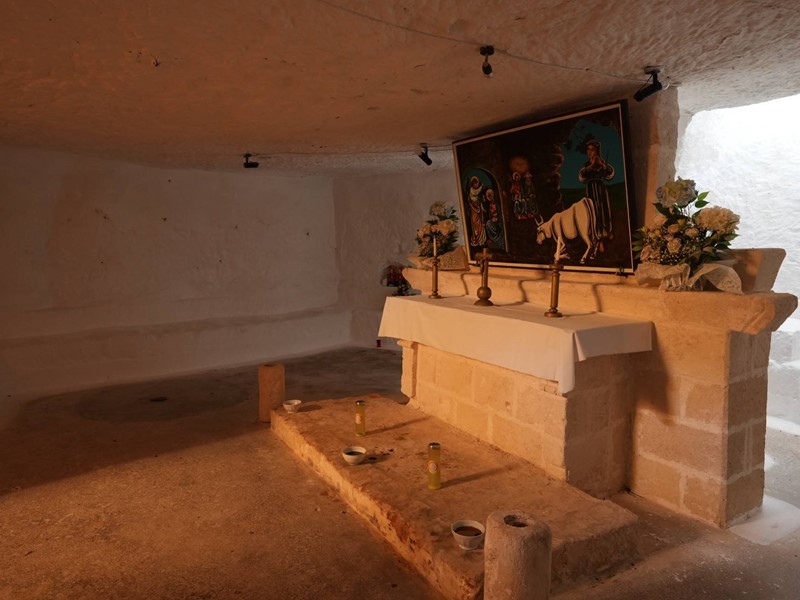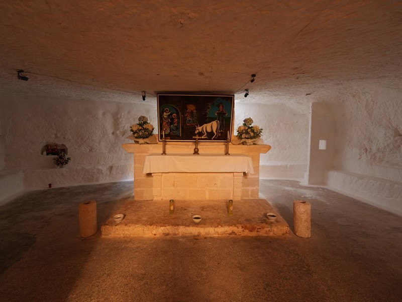La cripta, scavata nella roccia, custodisce un altare con affreschi e testimonianze di culto che rendono questa masseria un luogo intriso di spiritualità e fascino.