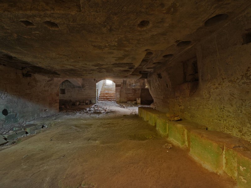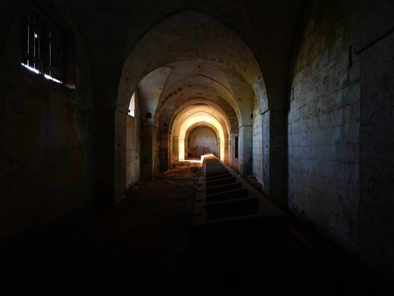 Frantoio ipogeo situato al di sotto del blocco principale, con volte sorrette da imponenti pilastri, antichi macchinari e tracce originali della lavorazione delle olive.