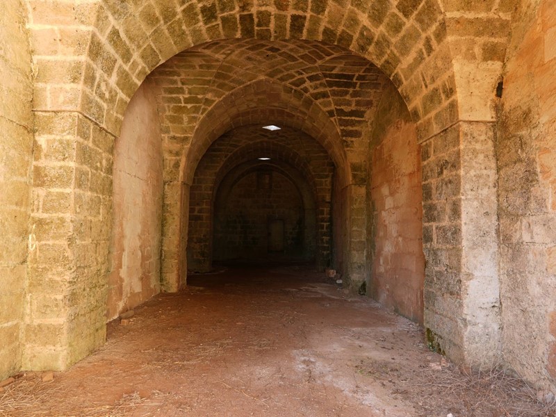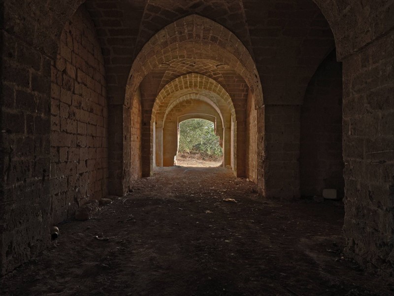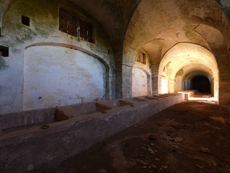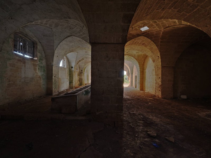 Terzo blocco: pianta a L, con lungo ambiente di circa 50 metri, coperture a volta e antiche mangiatoie in pietra.