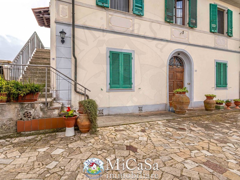 Laccesso alla proprietà avviene da un ampio cancello carrabile automatico: un grazioso vialetto conduce alla scala esterna che porta al piano primo. L'abitazione si apre su un ingresso tradizionale, proseguendo con una sala luminosa, una cucina abitabile con accesso a balcone, due spaziose camere matrimoniali, uno studio e un bagno finestrato con vasca.