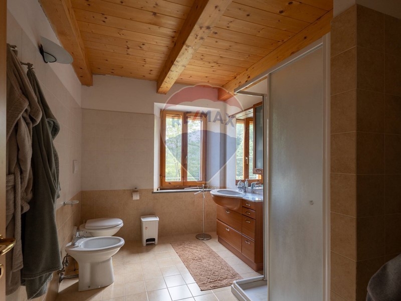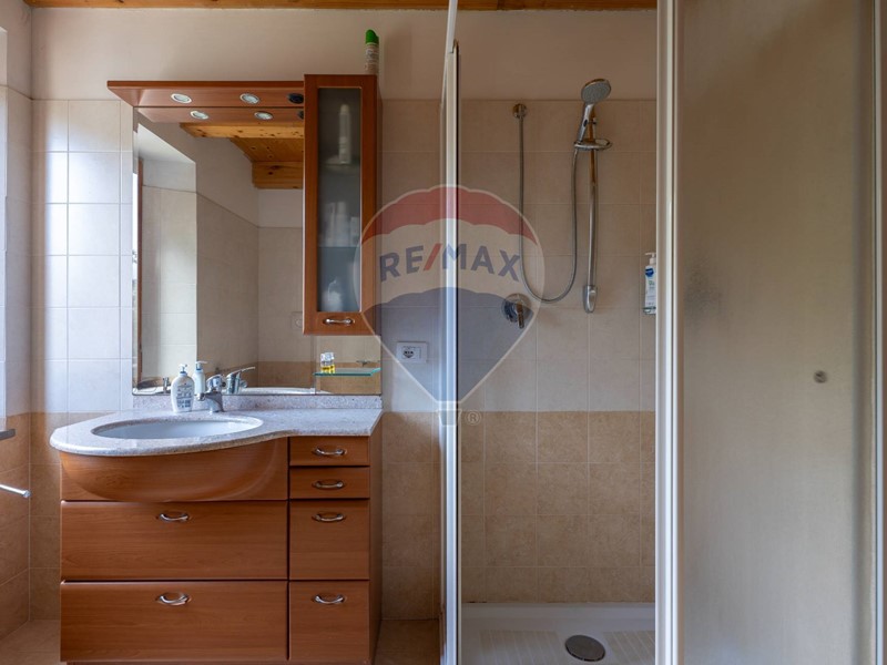 Comodo il bagno, con ampia doccia ed una funzionale nicchia-lavatrice.