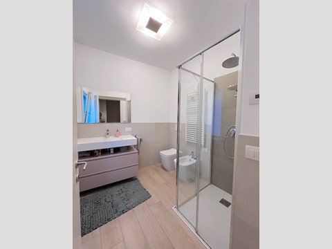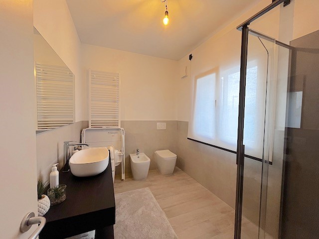Lo stesso piano ospita anche un bagno finestrato con doccia e un garage collegato internamente.