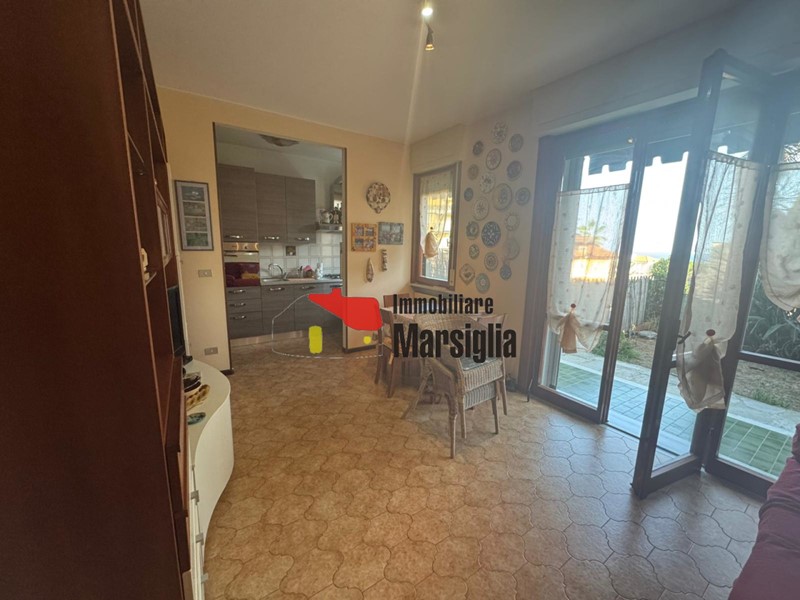 Al suo ingresso veniamo accolti dal corridoio che disimpegna gli ambienti, soggiorno con cucina a vista, camera da letto matrimoniale ed infine bagno con finestra. Dalla zona giorno e dalla camera si accede sul giardino/terrazzo di circa 70 mq dal quale si vede uno scorcio dl mare. Esposizione Sud-Est.