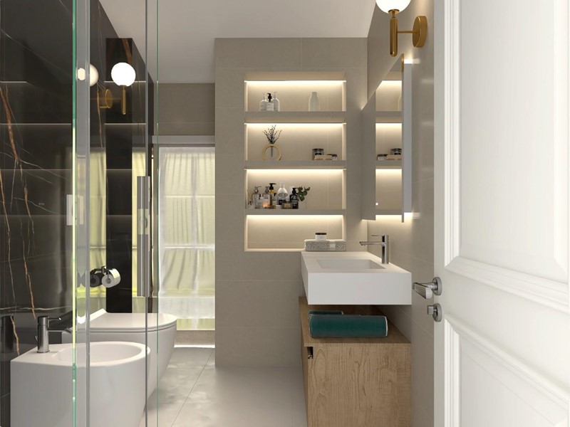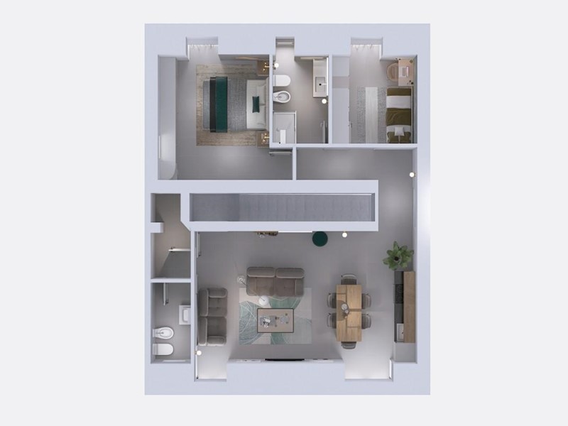 - due bagni: di cui uno di servizio con antibagno nella zona giorno ed uno padronale di pregio, finemente rifinito e dotato di finestra, situato nella zona notte per garantire comfort e riservatezza;