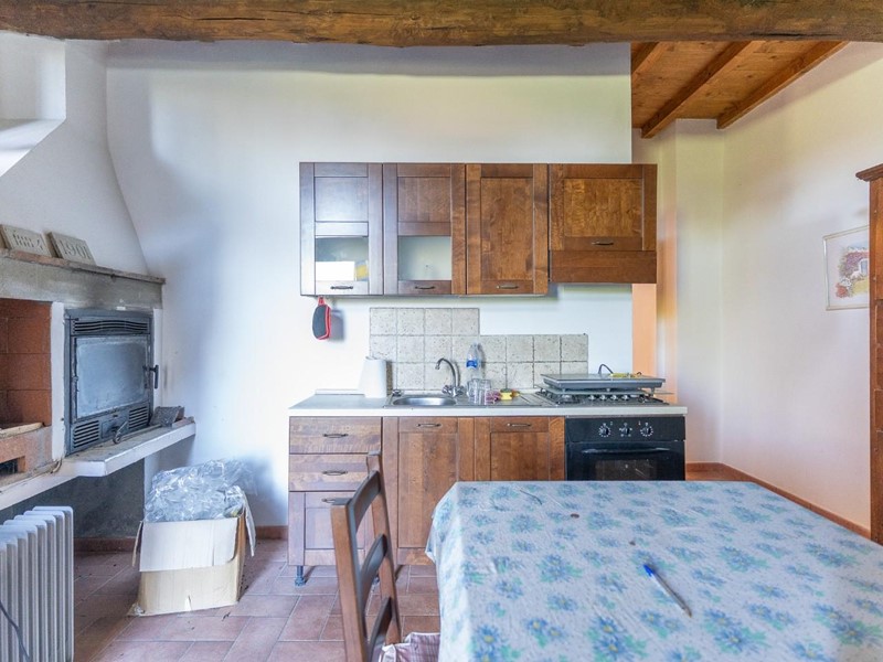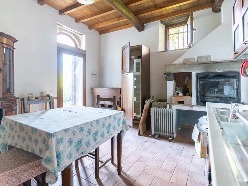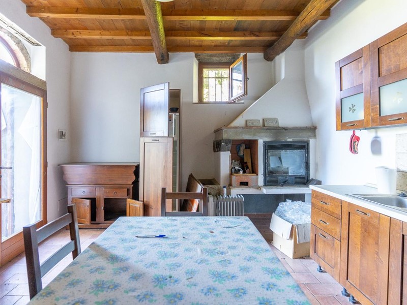 Possibilità di sostituzione del Termo-camino in cucina, travi a vista e pavimenti in cotto. APE = G
