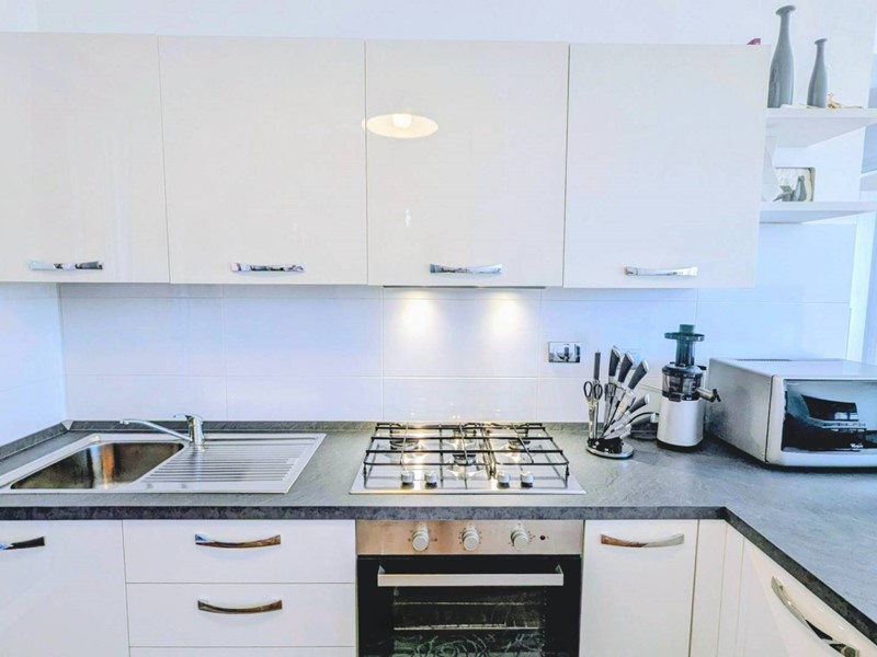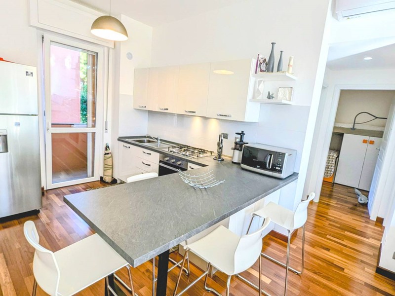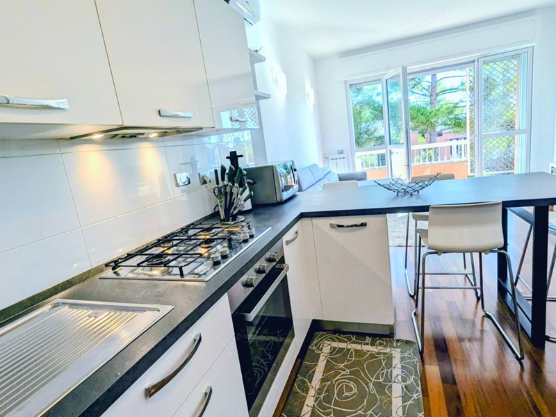 Perfetta la cucina completamente attrezzata e che dispone di una uscita su un'ulteriore balconcino di servizio.
