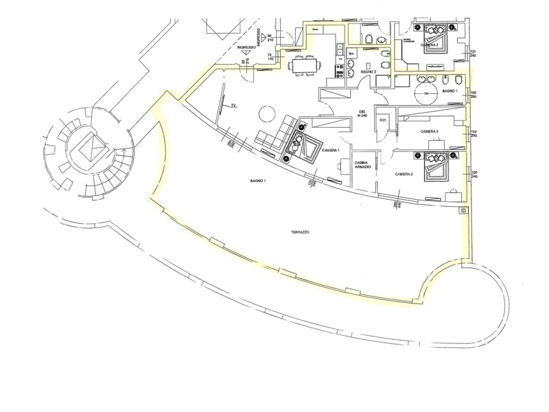 La soluzione è composta da soggiorno con angolo cottura a vista collegata al terrazzo, doppio bagno, doppio ripostiglio, camera matrimoniale con cabina armadio e n. 2 camere singole.