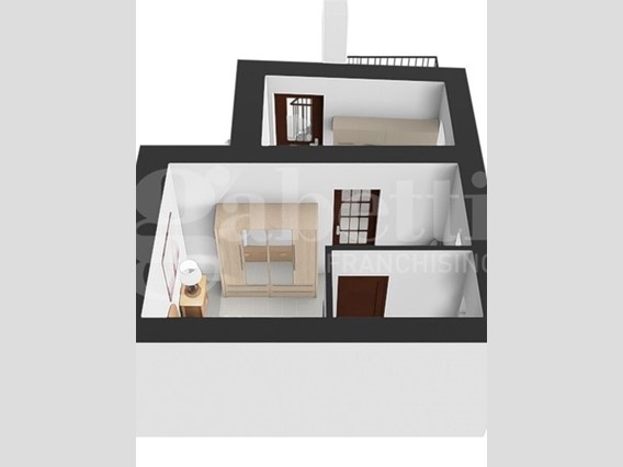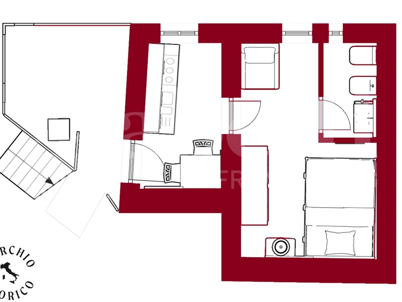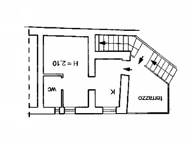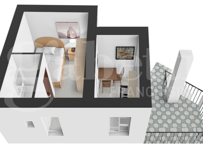 2) monolocale con cucina, camera, bagno, terrazzino a livello e ulteriore piccolo vano sottoposto al piano terra.