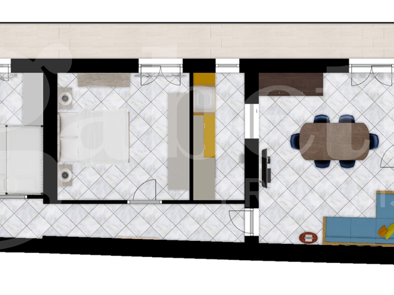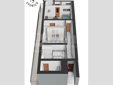 1) trilocale al primo piano con interessante doppio ingresso contrapposto che rende potenzialmemte e facilmente frazionabile la proprietà in due unità abitative; attualmente è suddiviso in angolo cottura con soggiorno living, corridoio, due camere da letto, due bagni, ripostiglio ed ampia balconata accessibile direttamente da tutti gli ambienti.