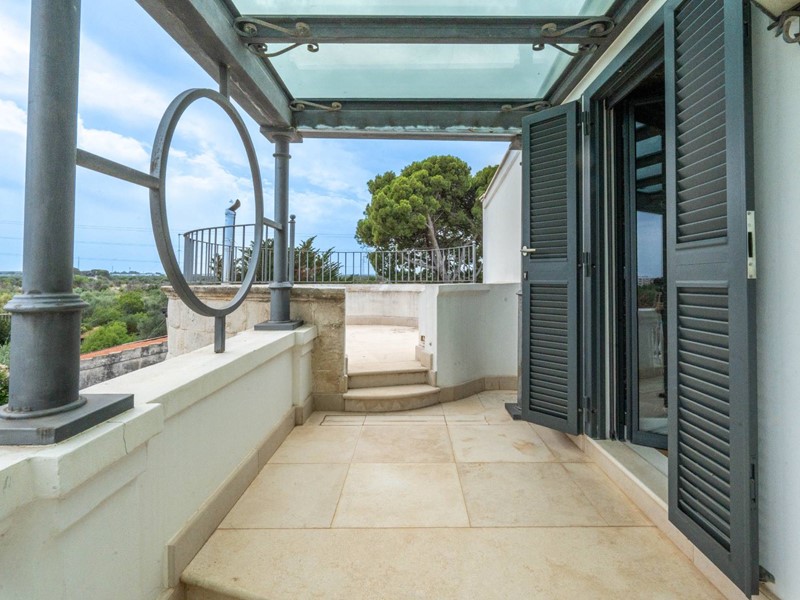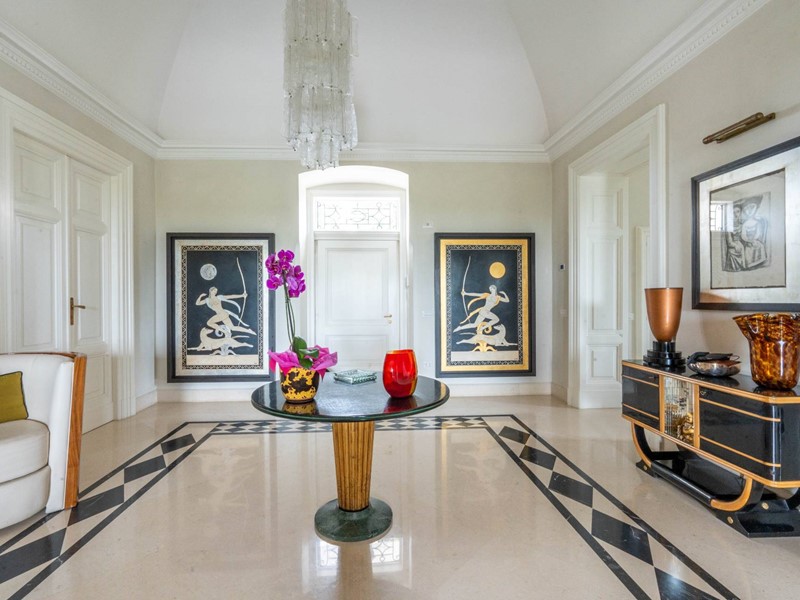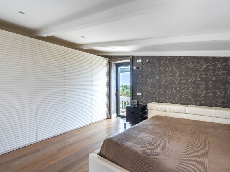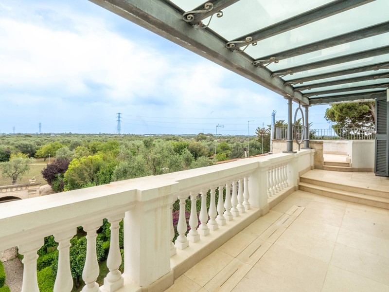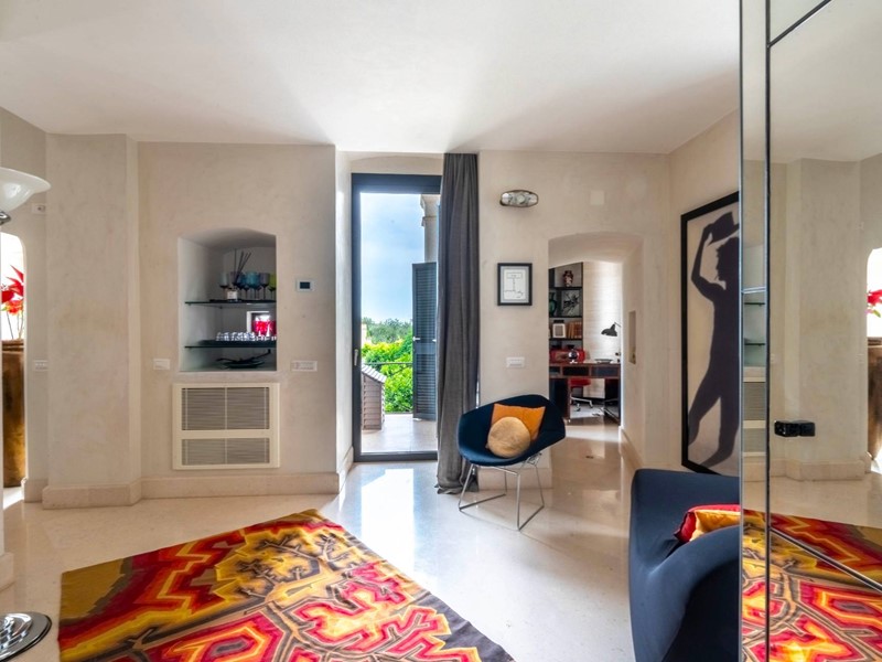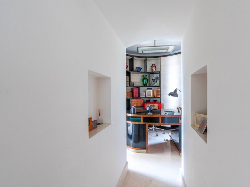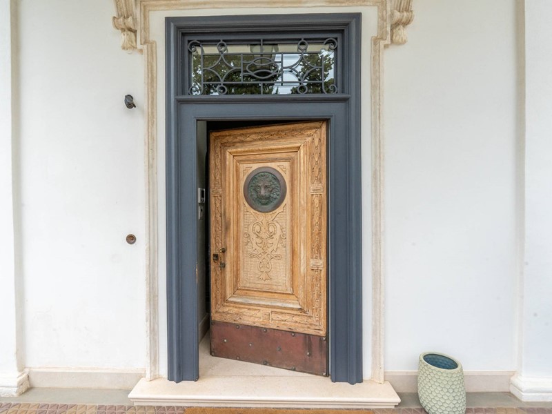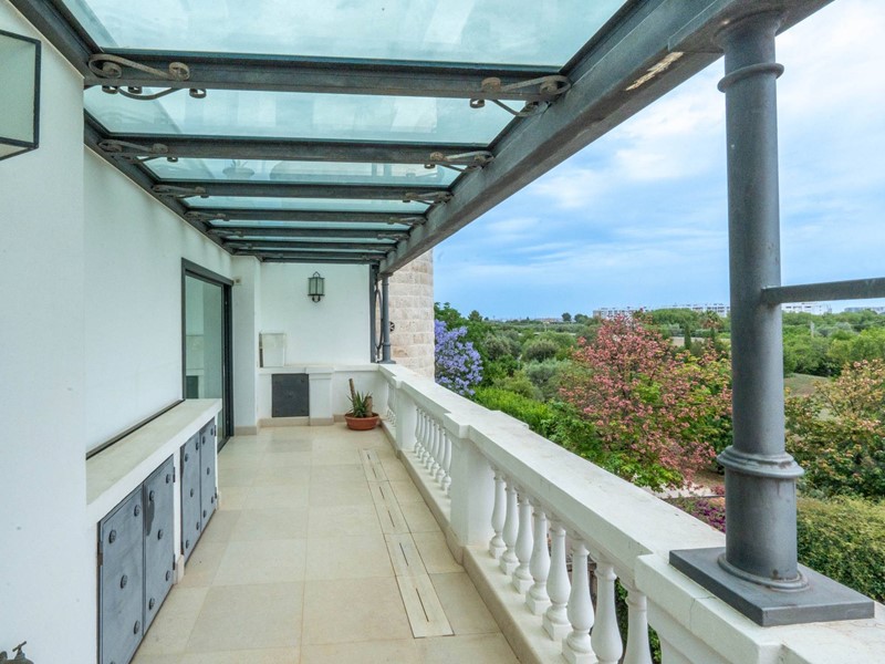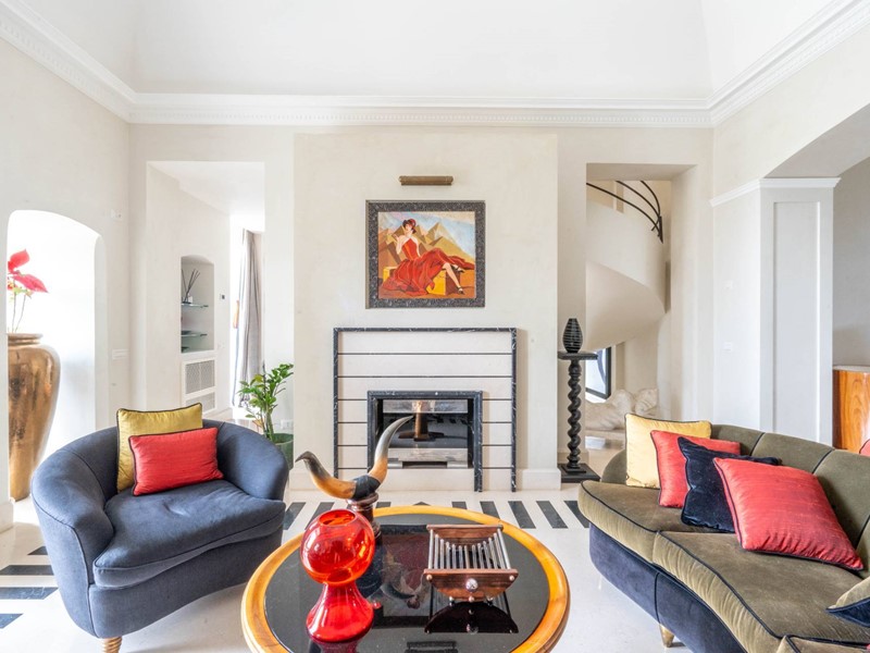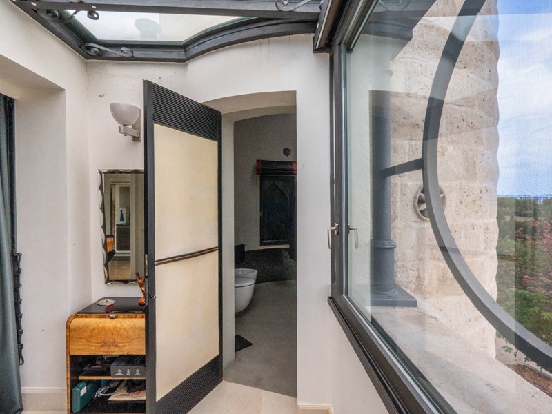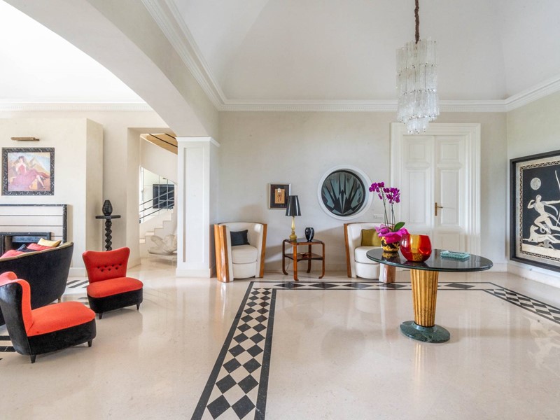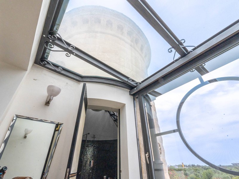 La villa, con una facciata che richiama i castelli medievali, presenta una loggia rinascimentale con colonne in pietra bianca e doppie scale che conducono agli ingressi del piano nobile. L'interno comprende 3 livelli serviti da ascensore. Al piano terra, l'ingresso conduce a un'area seminterrata dedicata al relax e allo svago. Al piano rialzato si trovano una zona living luminosa, un ampio salone con camino, una cucina abitabile, una zona pranzo e uno studio nel torrione. Al piano superiore troviamo un'ulteriore zona giorno con cucina, 3 camere da letto con bagni en suite e una suite padronale, cabina armadio e 2 bagni, oltre a due terrazzi panoramici.
