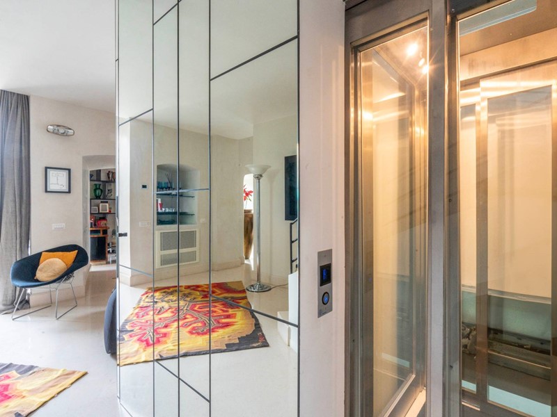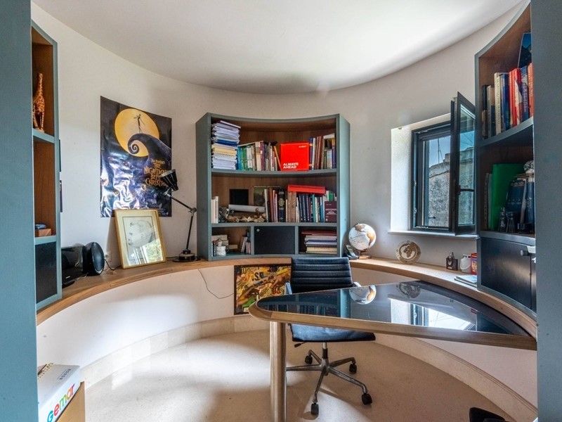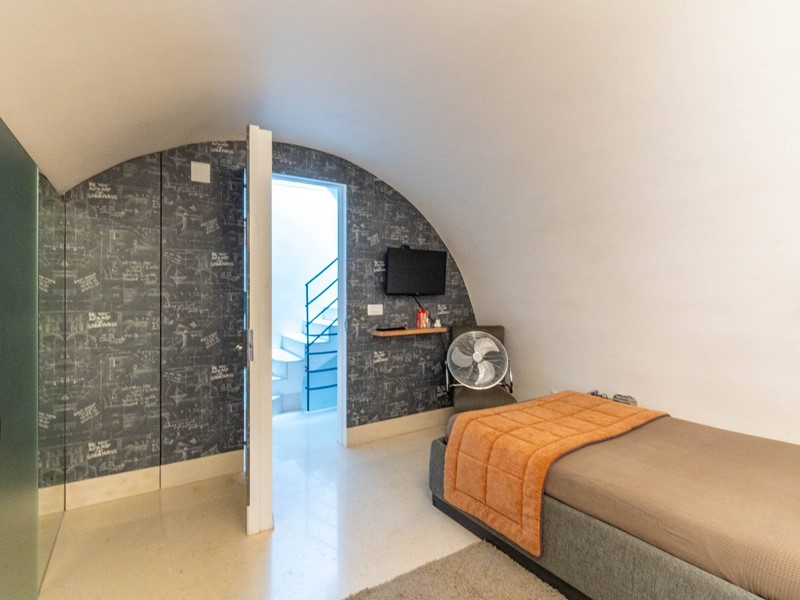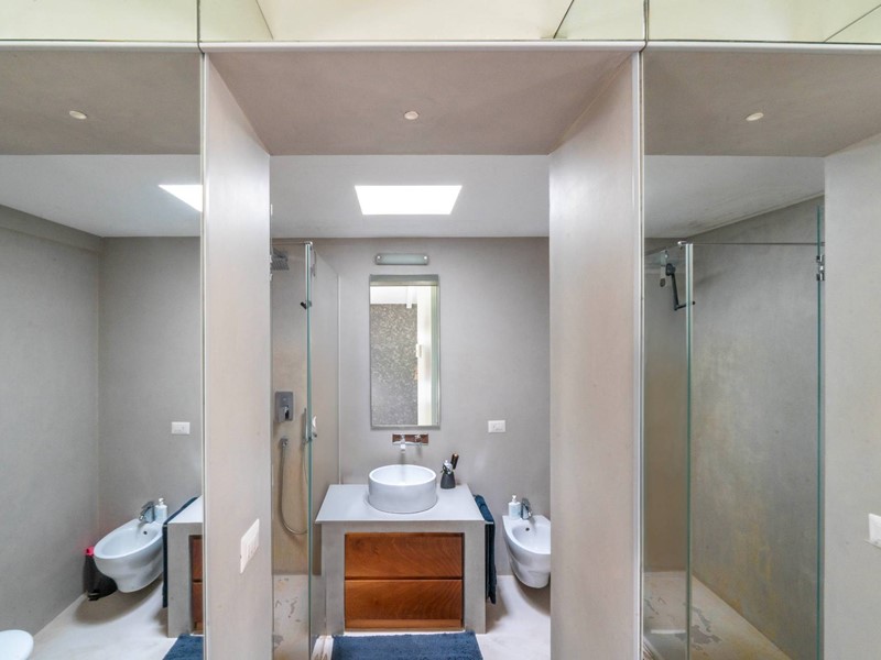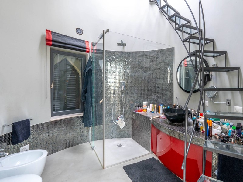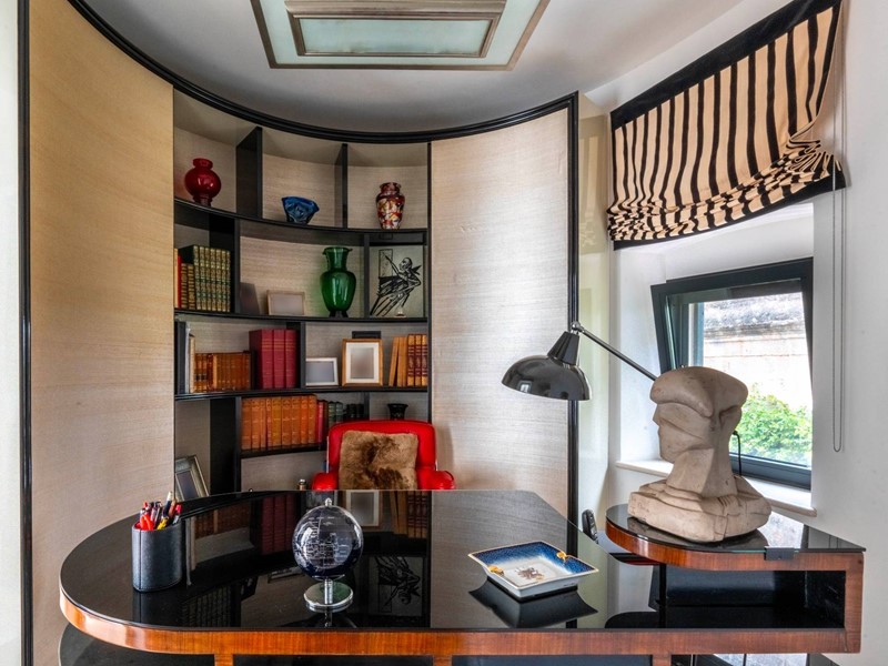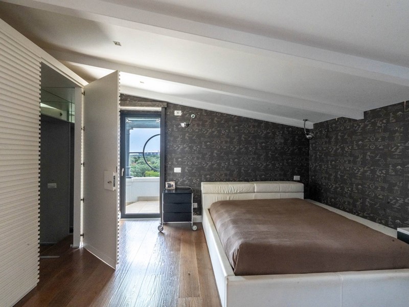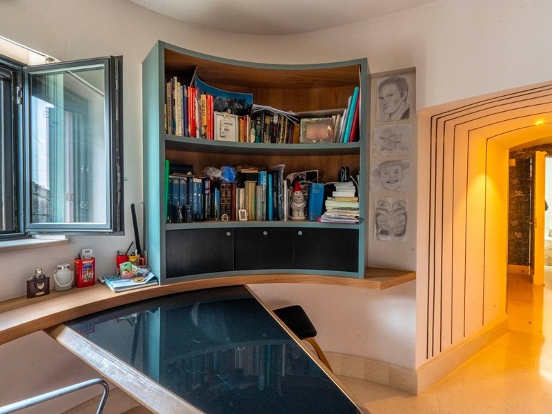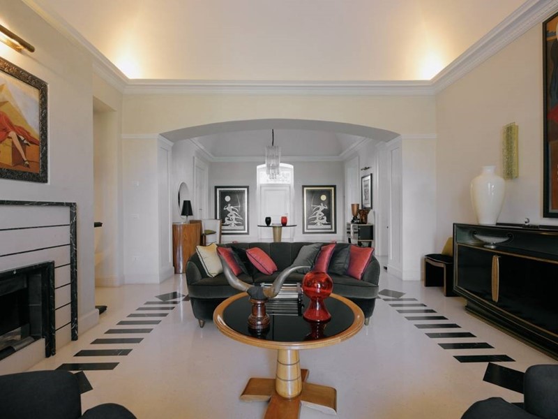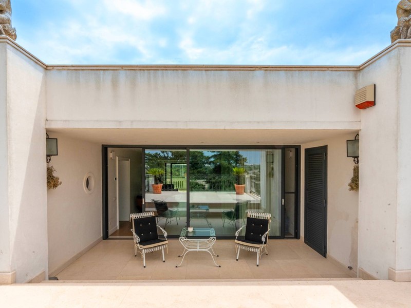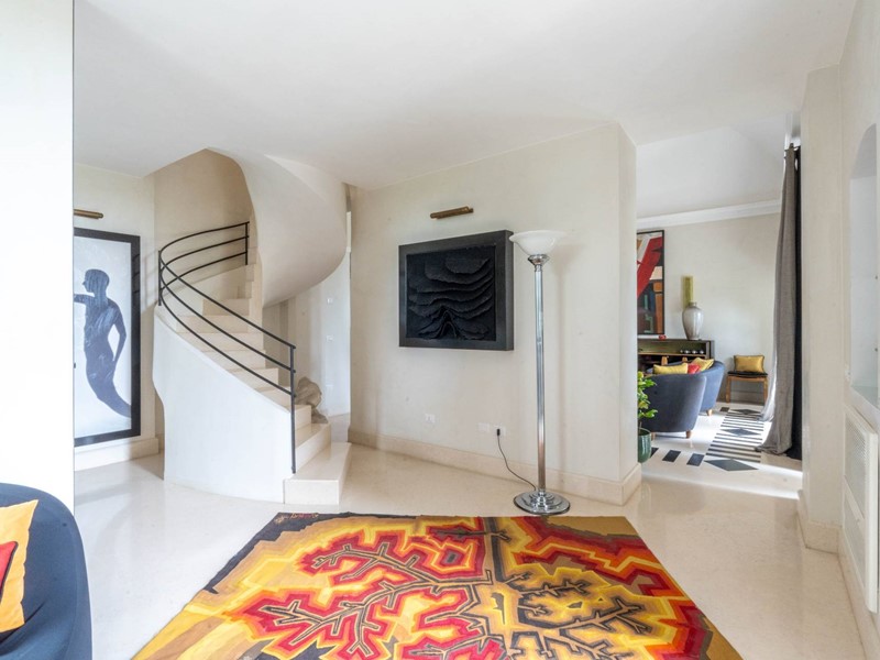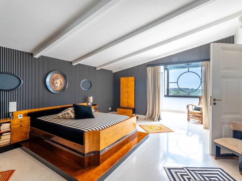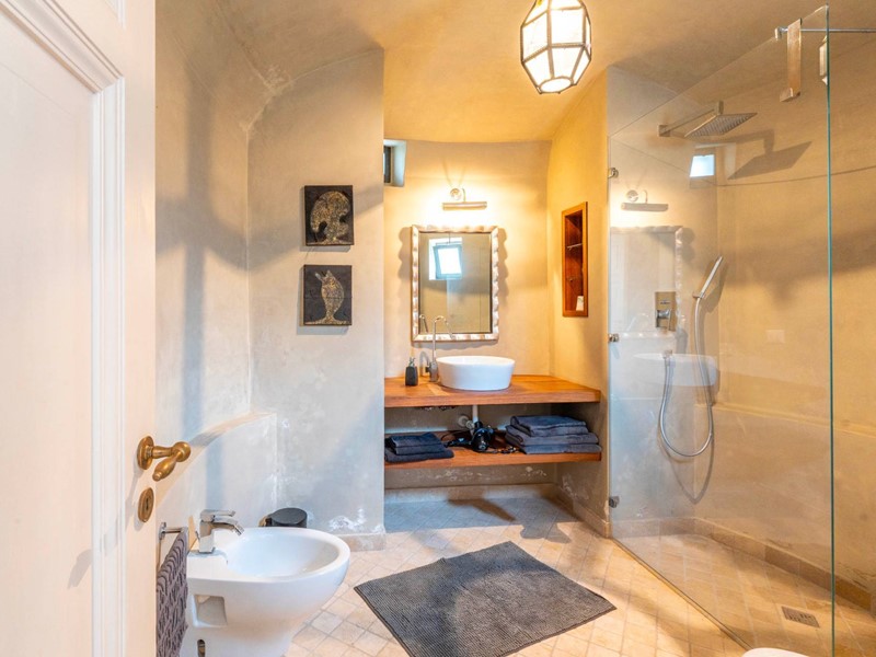 La villa, con una facciata che richiama i castelli medievali, presenta una loggia rinascimentale con colonne in pietra bianca e doppie scale che conducono agli ingressi del piano nobile. L'interno comprende 3 livelli serviti da ascensore. Al piano terra, l'ingresso conduce a un'area seminterrata dedicata al relax e allo svago. Al piano rialzato si trovano una zona living luminosa, un ampio salone con camino, una cucina abitabile, una zona pranzo e uno studio nel torrione. Al piano superiore troviamo un'ulteriore zona giorno con cucina, 3 camere da letto con bagni en suite e una suite padronale, cabina armadio e 2 bagni, oltre a due terrazzi panoramici.