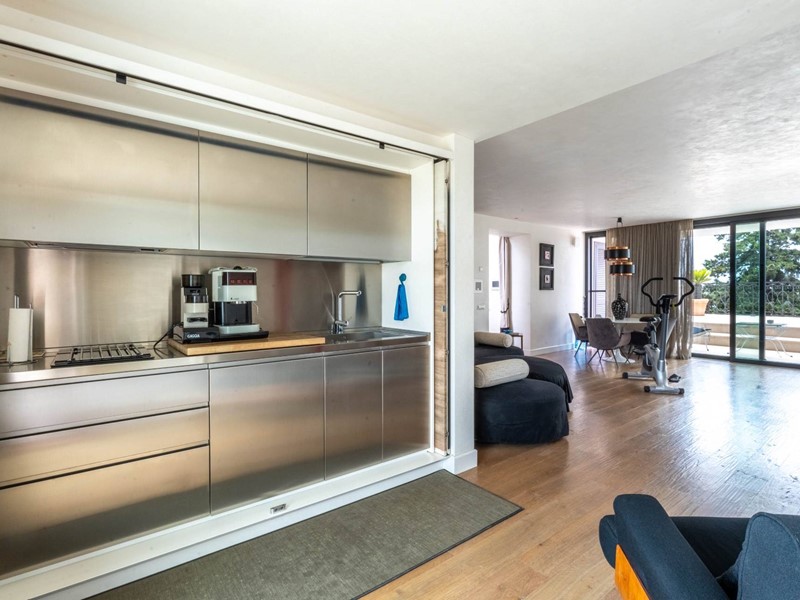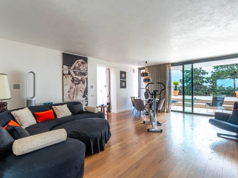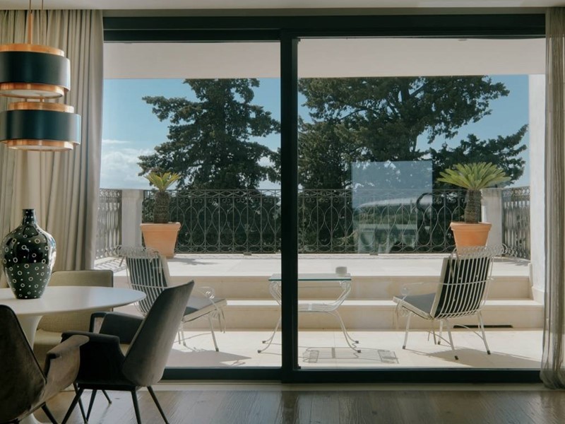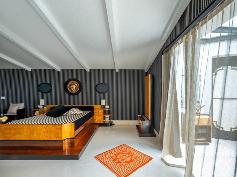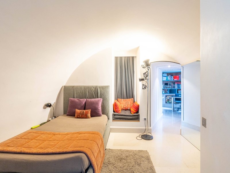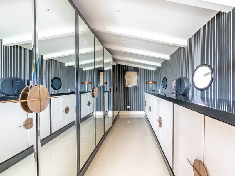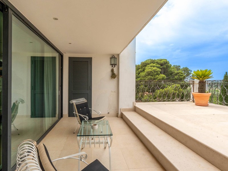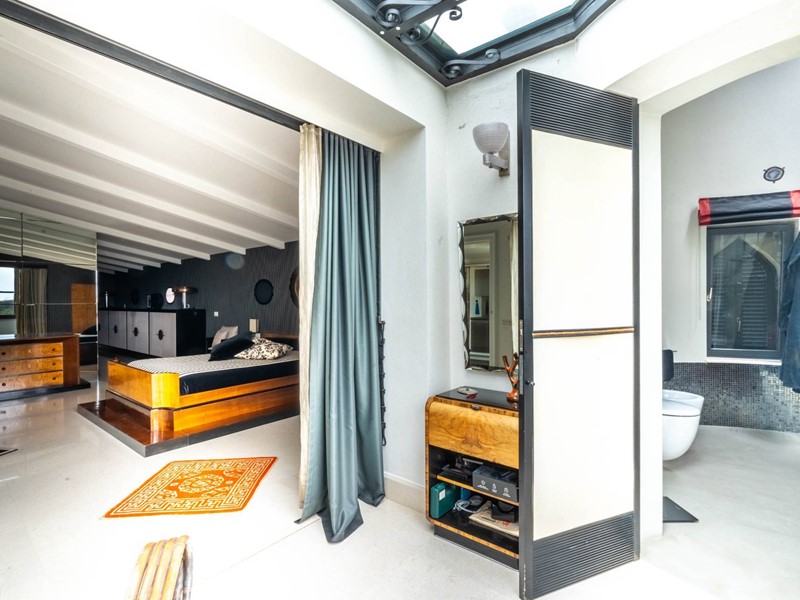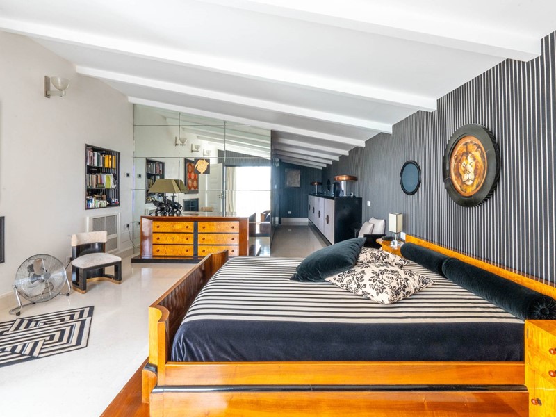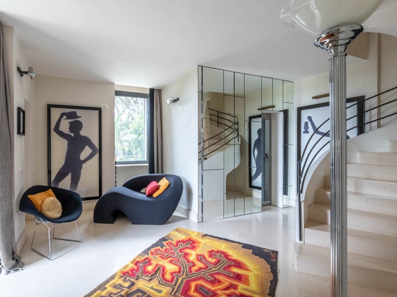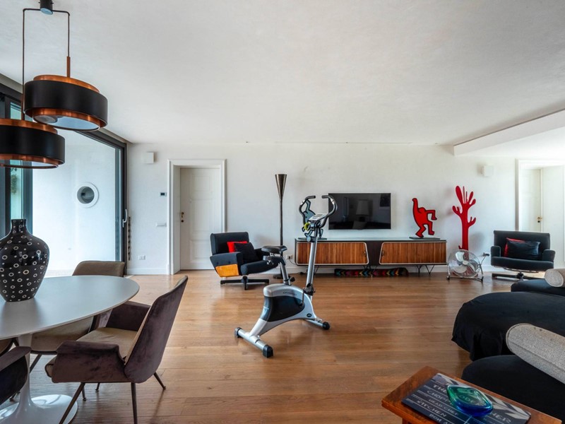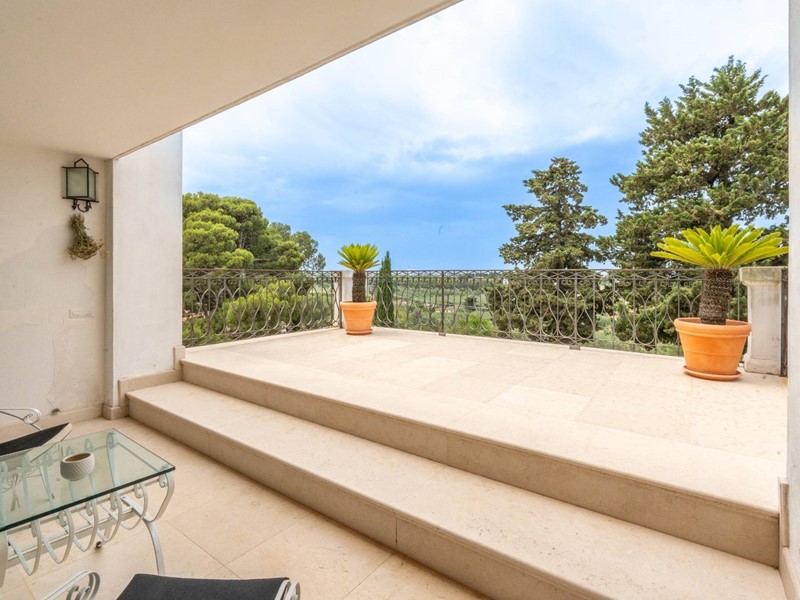 La villa, con una facciata che richiama i castelli medievali, presenta una loggia rinascimentale con colonne in pietra bianca e doppie scale che conducono agli ingressi del piano nobile. L'interno comprende 3 livelli serviti da ascensore. Al piano terra, l'ingresso conduce a un'area seminterrata dedicata al relax e allo svago. Al piano rialzato si trovano una zona living luminosa, un ampio salone con camino, una cucina abitabile, una zona pranzo e uno studio nel torrione. Al piano superiore troviamo un'ulteriore zona giorno con cucina, 3 camere da letto con bagni en suite e una suite padronale, cabina armadio e 2 bagni, oltre a due terrazzi panoramici.