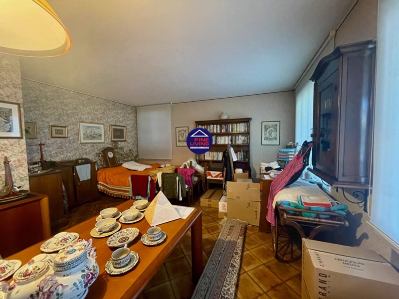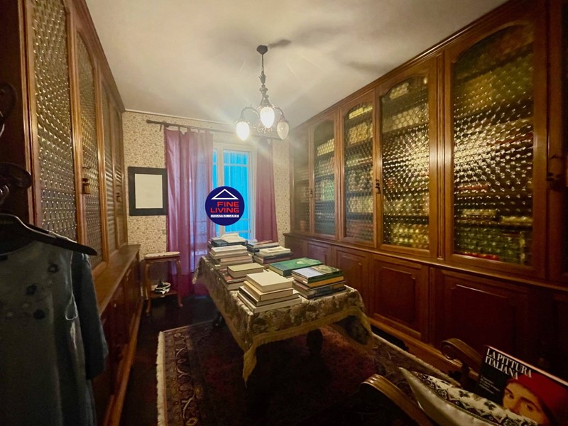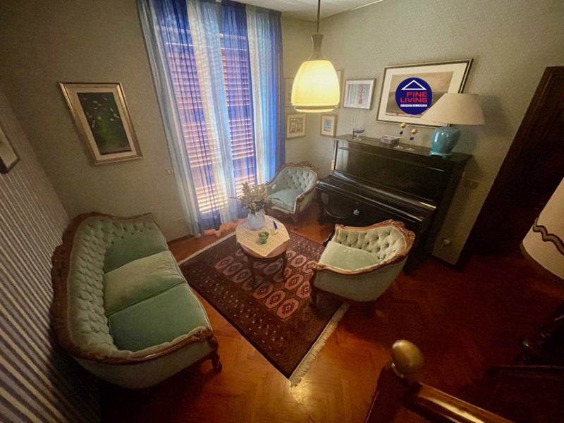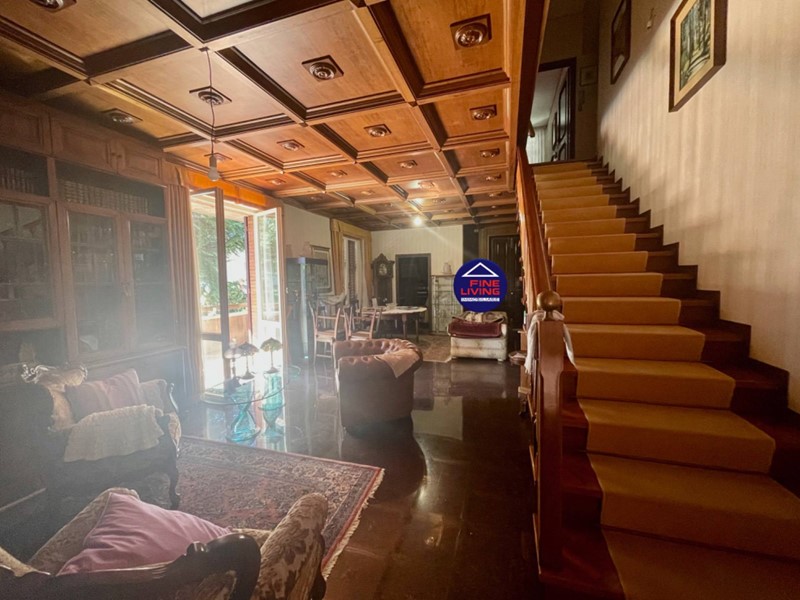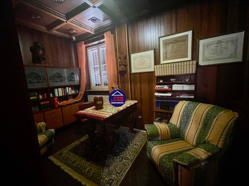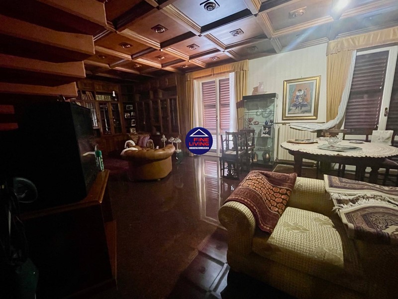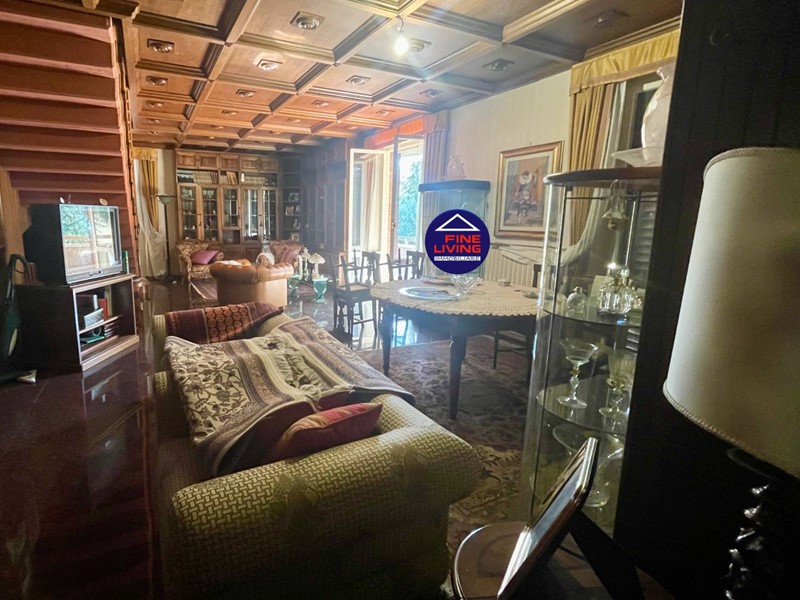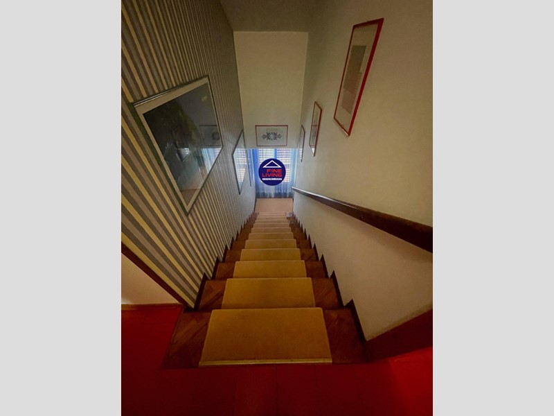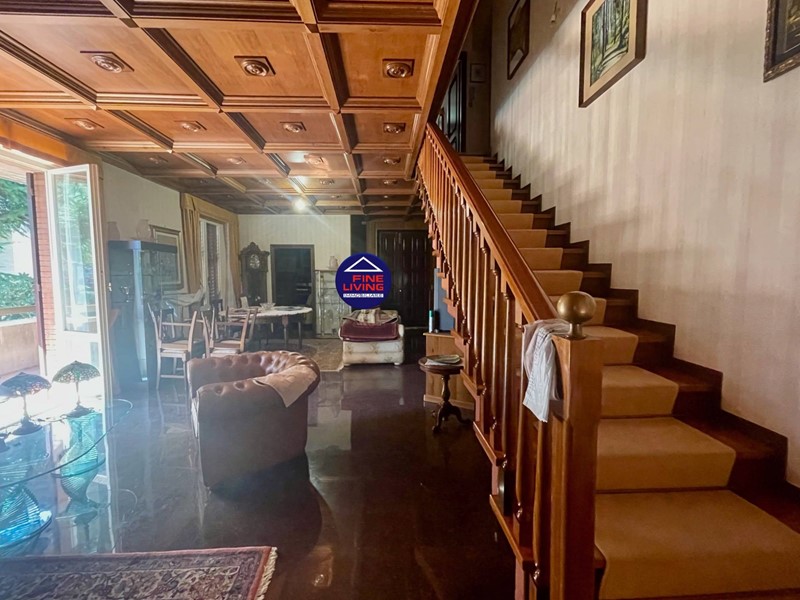 Primo Piano: grande salone con soffitto a cassettoni in legno di noce, studio e grande terrazzo perimetrale, biblioteca con serra chiusa con vetrata, disimpegno, camera da letto con balcone, bagno con vasca.