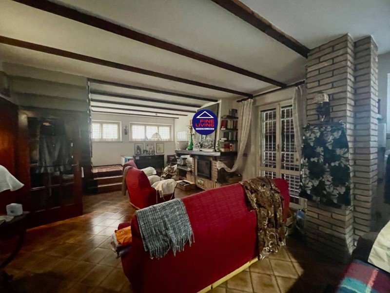 Piano Terra: cucina abitabile, ampio soggiorno, bagno e grande taverna con camino e porte-finestre che affacciano sul giardino e sul gazebo. Pavimentazione in piastrelle effetto cotto.