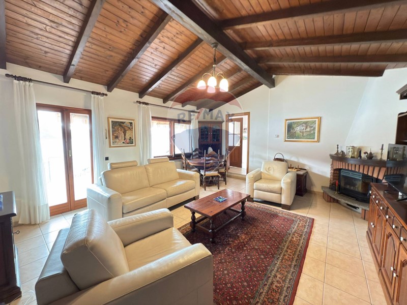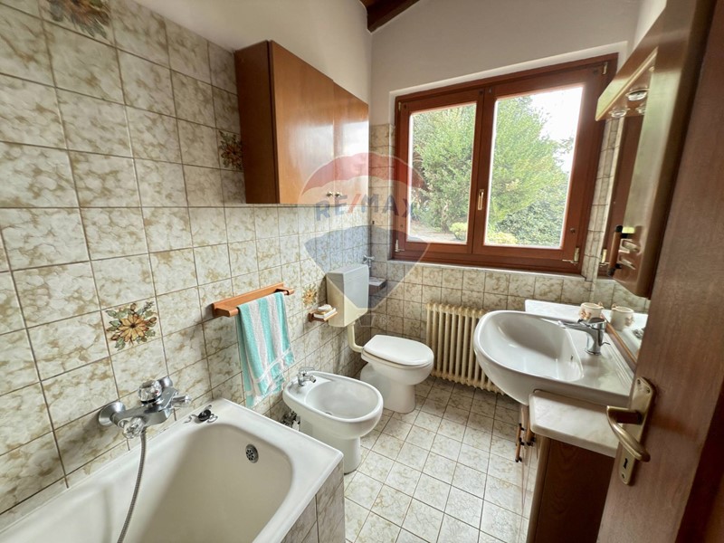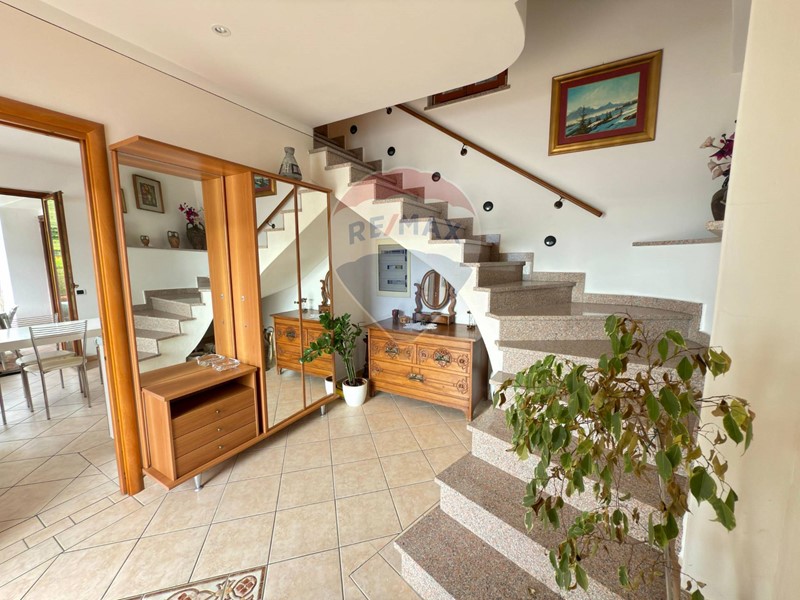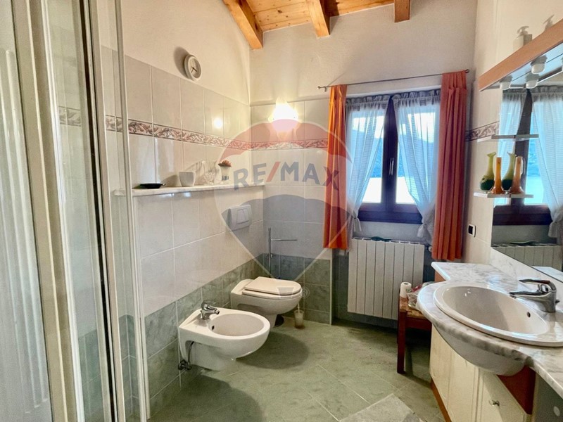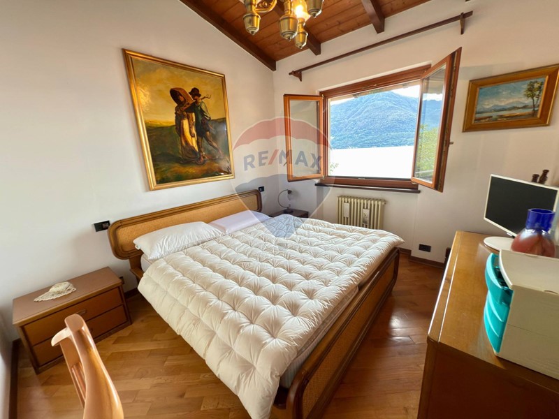 Dallingresso si raggiunge poi, a piano primo, la terza camera matrimoniale dotata di un balcone, un accesso diretto al giardino ed al secondo ampio bagno con doccia. Anche questi locali hanno il tetto a vista e questo il rende particolarmente ariosi e luminosi. Da questo livello, se possibile, la vista lago è ancora più bella. La villa ha poi un locale tecnico/lavanderia, un piccolo laboratorio/ricovero attrezzi ed un terzo grande ripostiglio sotto il portico della cucina. Le rifiniture sono classiche e di qualità.