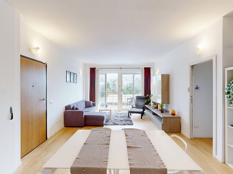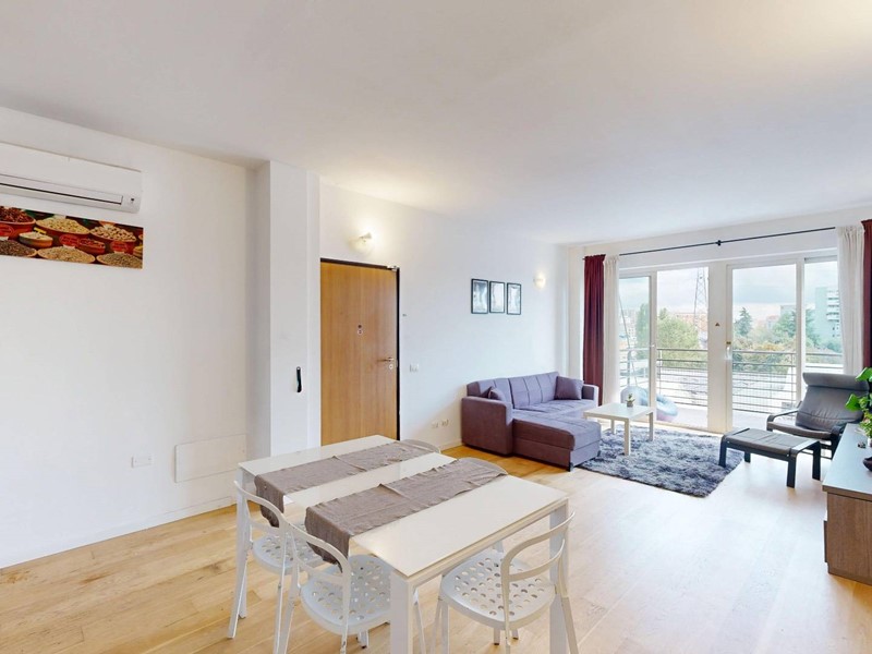 Lappartamento ha unampia e luminosa zona giorno con cucina a vista e terrazzo di 10 mq.